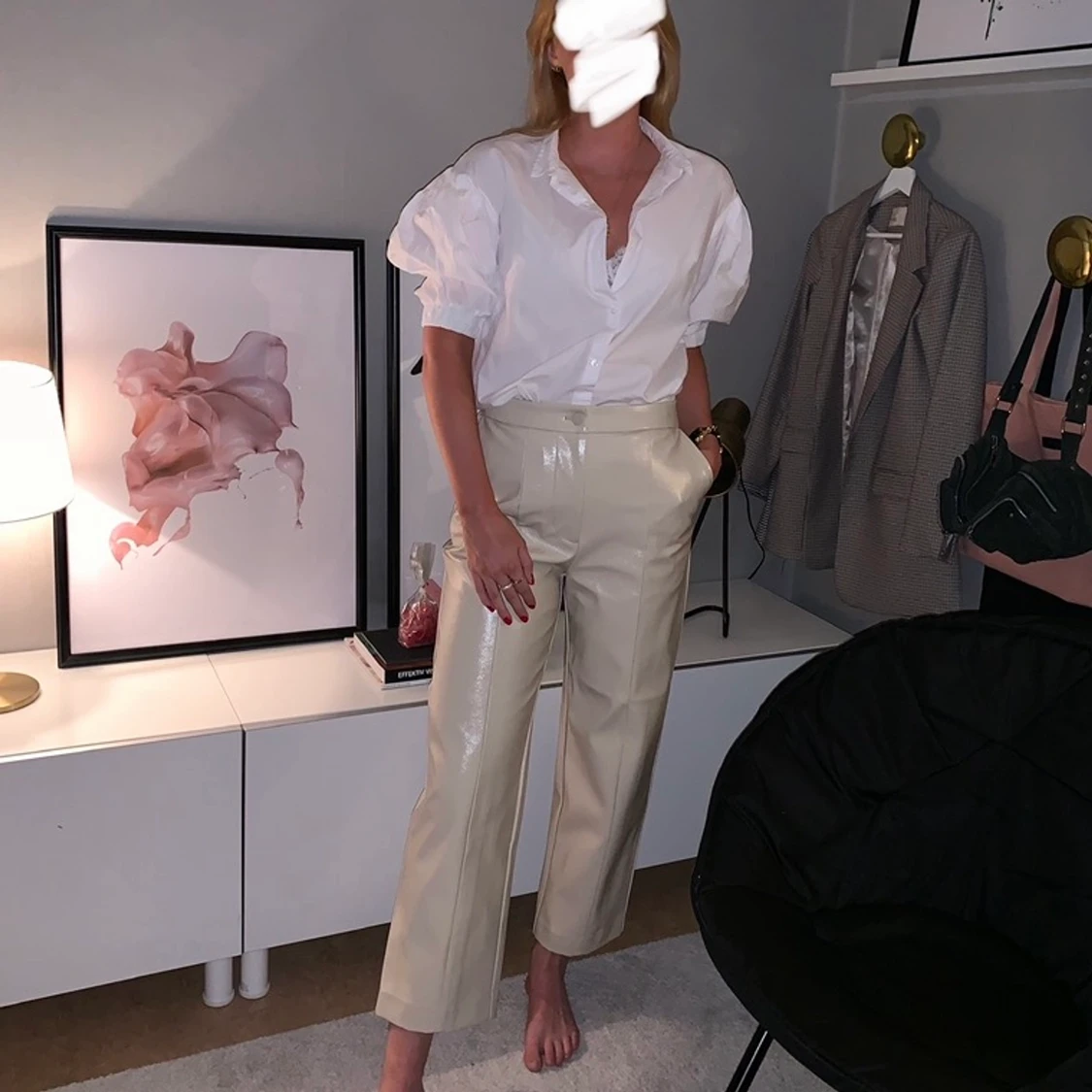 Cremevit byxa från weekday, enkelt att dressa upp och ner med olika material till byxorna som är i någon form av läderimitation.
