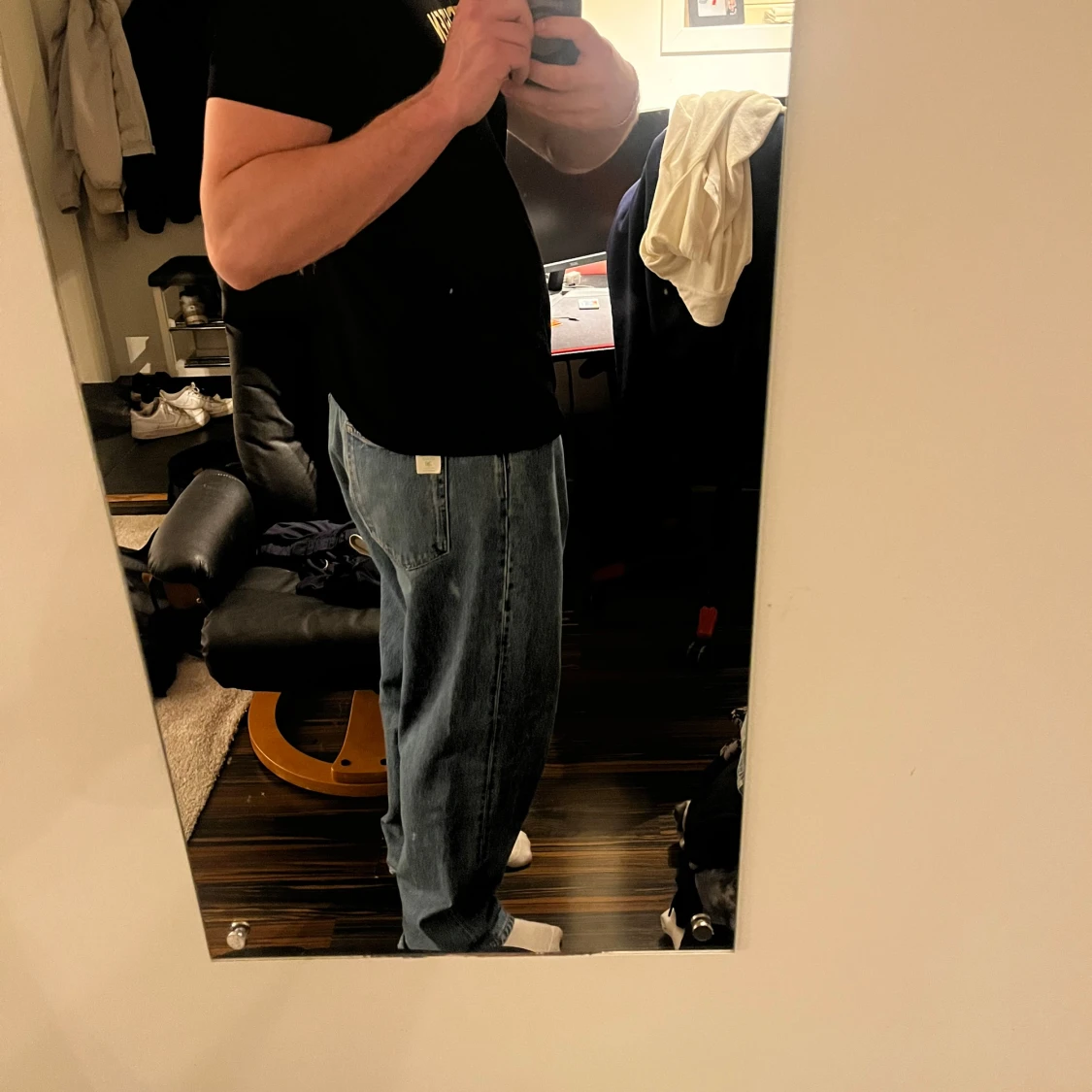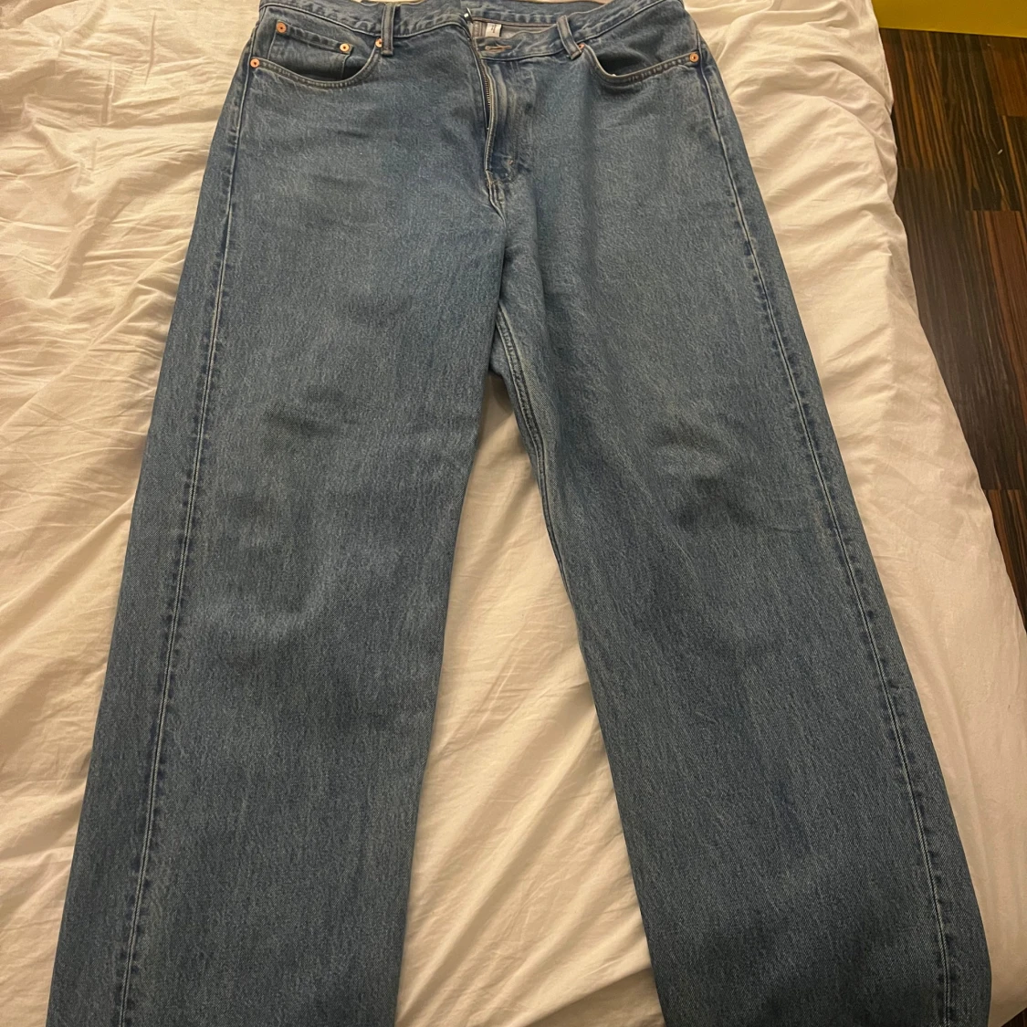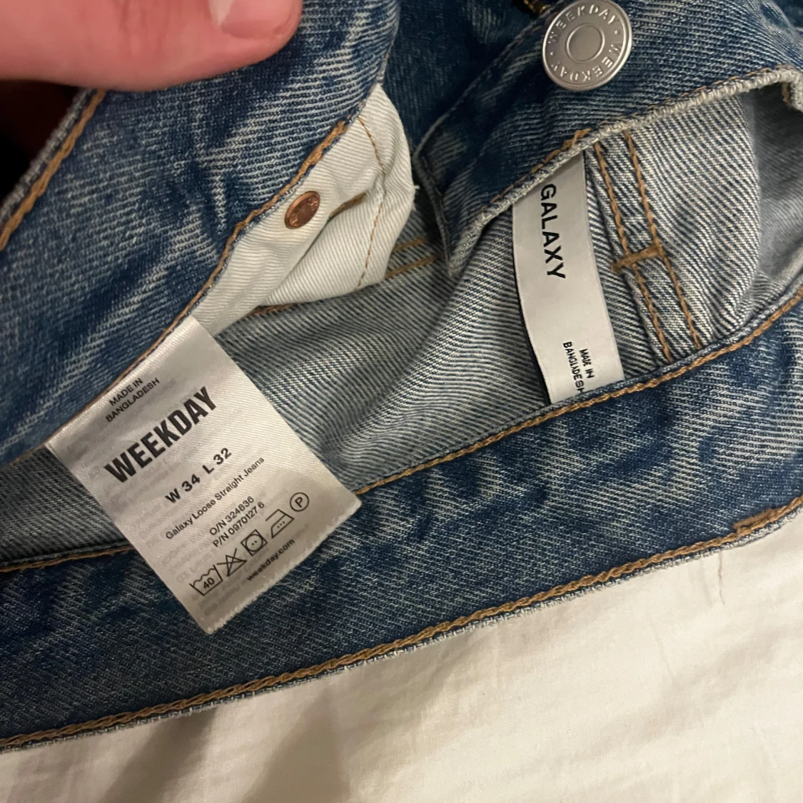 Säljer ett par klassiska blå jeans från Weekday, modellen Galaxy. Jeansen har rak passform, fem fickor och normal midja. Perfekta för dig som gillar en enkel och tidlös stil. Tydliga sömmar och knappgylf. Lite för stora för min smak men i toppskick!