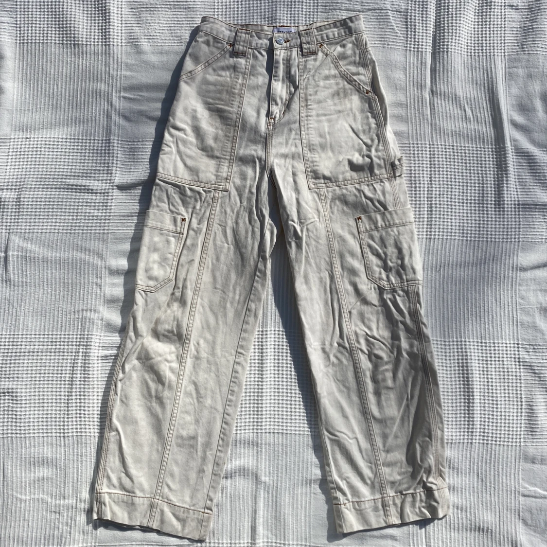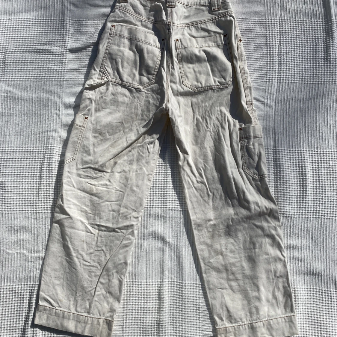 Byxor från weekday i modellen Grow workwear trousers. Jättesnygga! Lite fläckar från jord runtom på dem, då jag haft de när jag varit ute med hunden. Därav billigt pris, men går säkert att bleka eller skrubba bort!