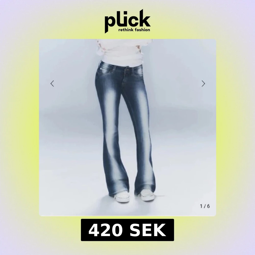 Snygga blå bootcut jeans med en klassisk femficksdesign och ljusa tvättade detaljer. Perfekta för en avslappnad stil med en touch av retro. De har en knapp- och dragkedjestängning. Slutsåld på hemsidan i nästan alla storlekar.