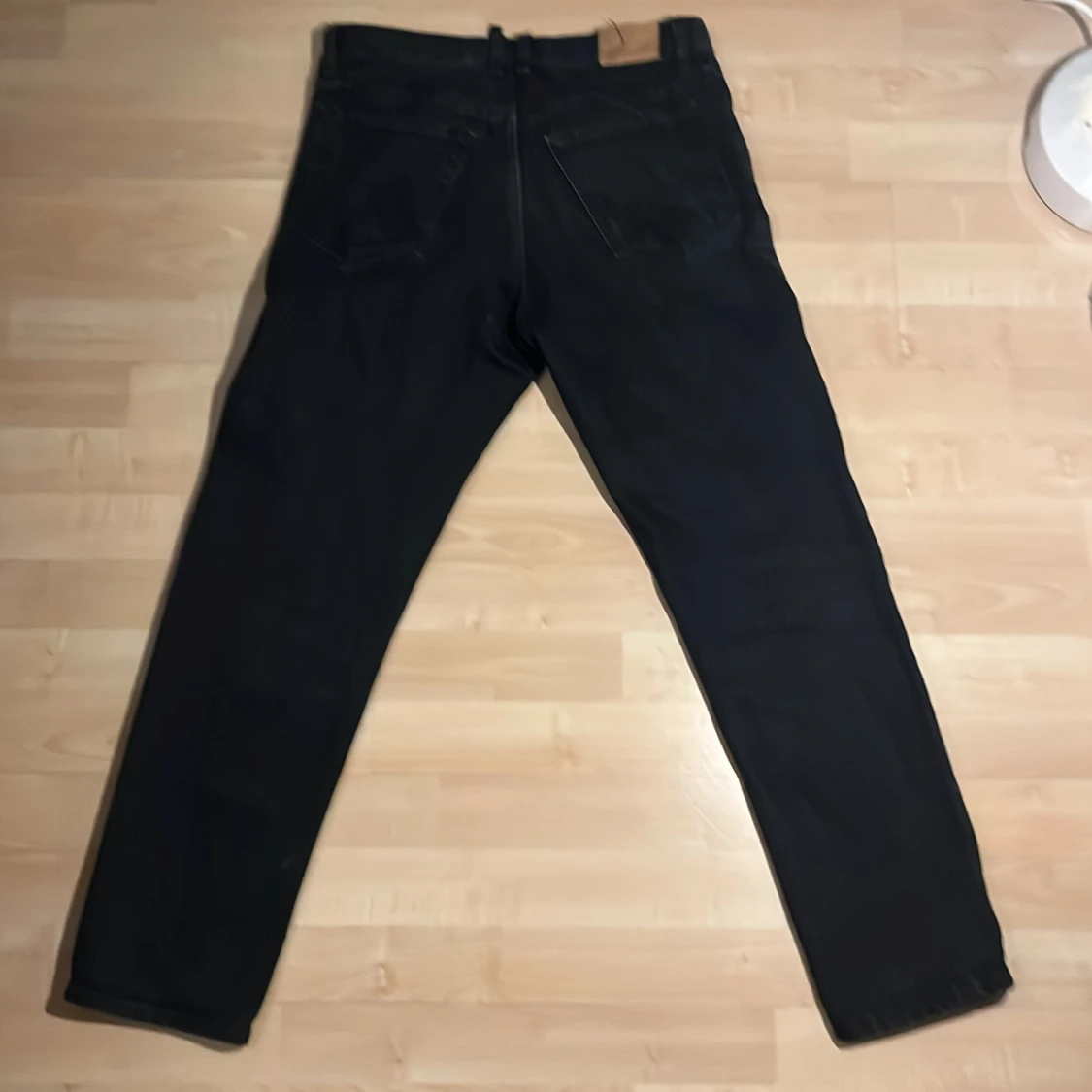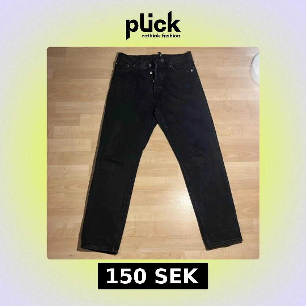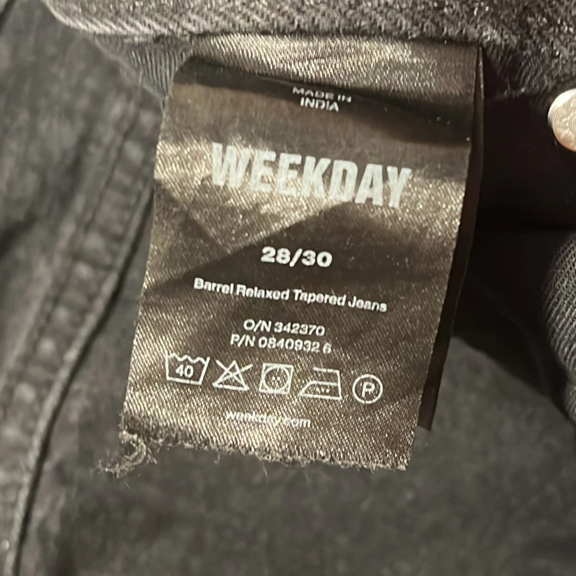 Säljer ett par svarta jeans från Weekday i modellen Barrel Relaxed Tapered. De har en avslappnad passform med avsmalnande ben och är tillverkade i ett bekvämt material. Perfekta för en stilren look.