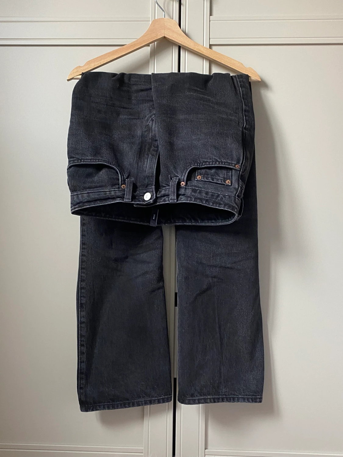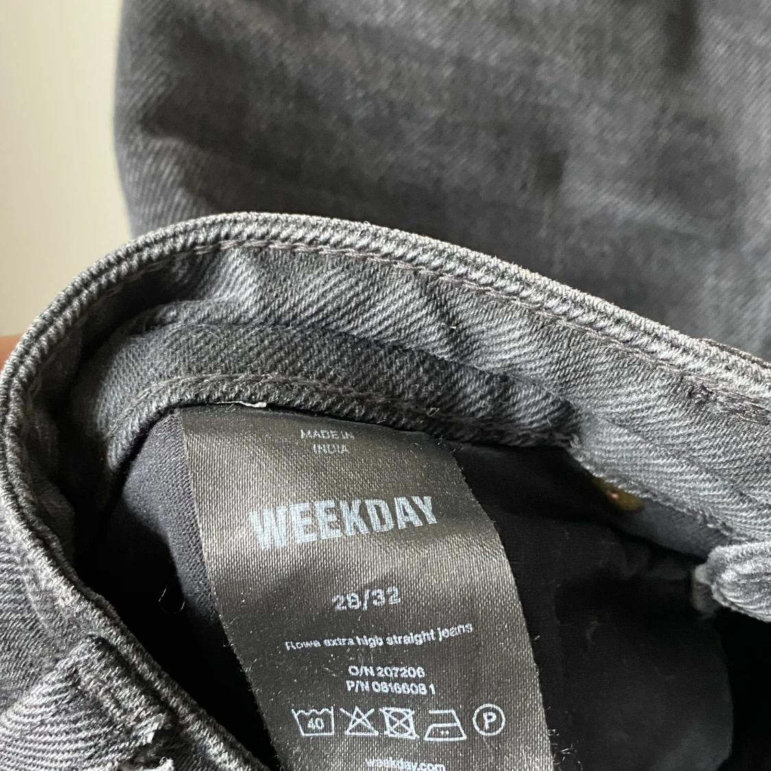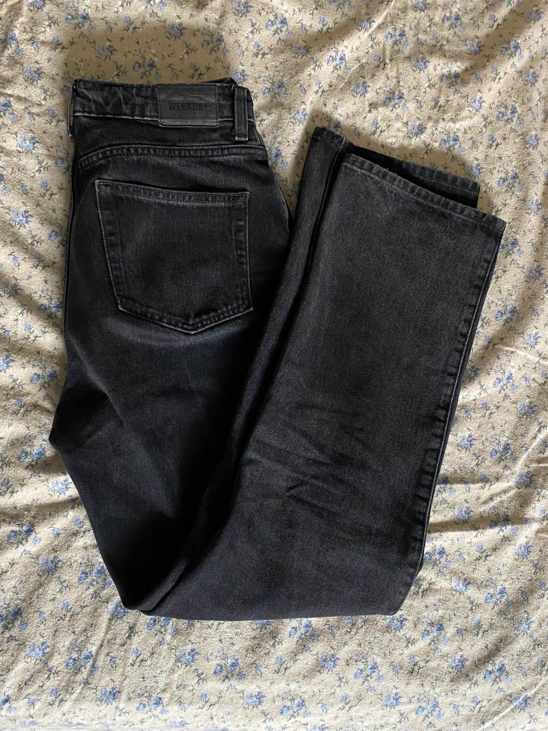 Jeans från Weekday i modellen Rowe. Supersnygg svart färg och sitter helt perfekt! Tyvärr blivit för små för mig. Strl 28/32, passar bra i längden för mig som är 172cm.