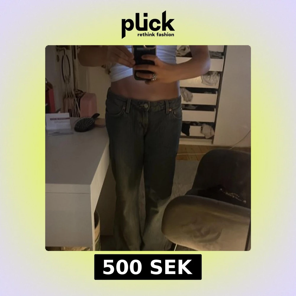 Säljer ett par blåa jeans från Weekday🤭 med bootcut-modell och låg midja. Jeansen har klassisk femficksdesign, dragkedja och knapp🤗 framtill samt en snygg skinnpatch bak i midjan🤪. Lite mer av en baggy vibe skulle jag säga storlek w27 L34 pris kan diskuteras