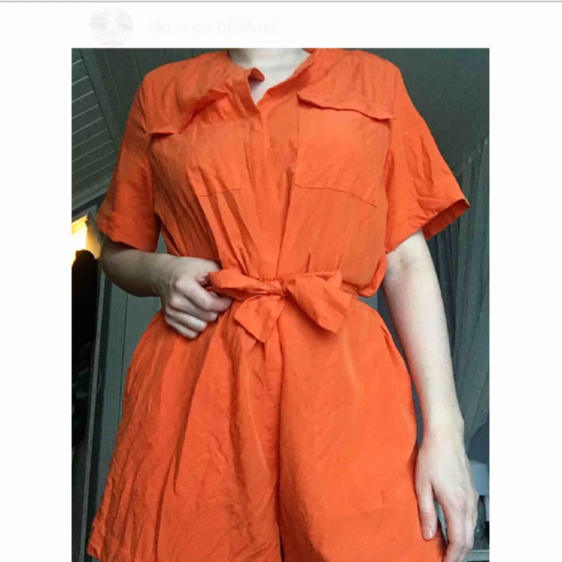 En klarorange byxdress med knappar ifram och ett midjeband i storlek EU 40. Använd och tvättad en gång, pga att storleken är snäppet för stor för mig. Min info: Längd: 176cm Överdel: S/M Underdel: L/Xl