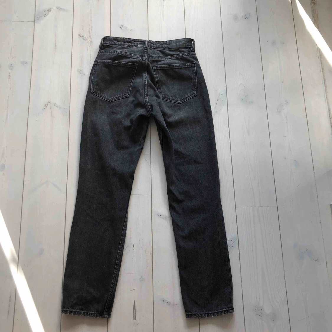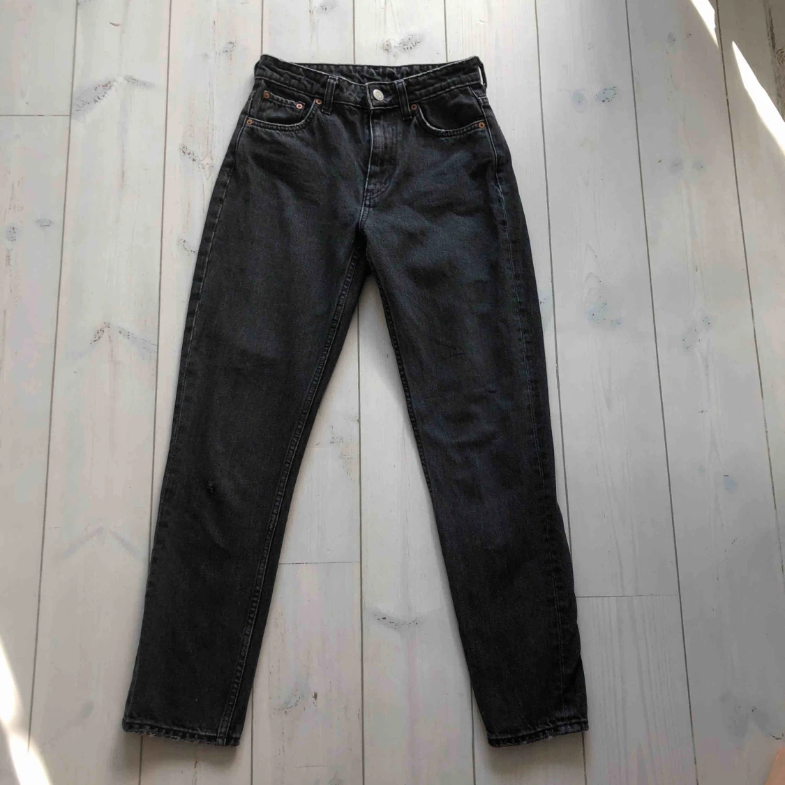 Gråa Mom jeans från weekday i modellen Seattle, dom är ljusare i verkligheten än på bilderna. Byxorna har ett litet hål vid knät men syns knappt nät man har på sig dom.