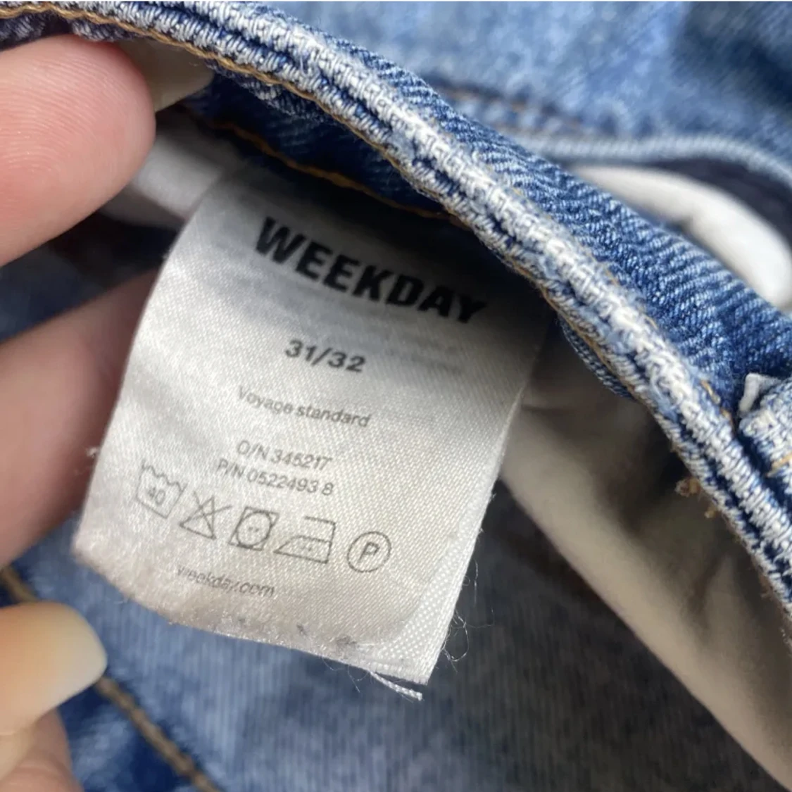 Jätte fina o knappt oanvända weekday jeans i stl 31/32. Står inte för frakten o för postens slarv.