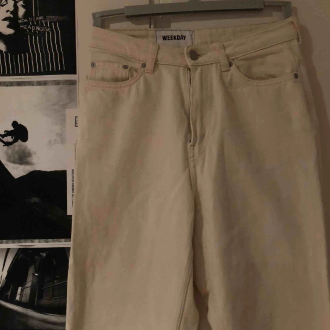 Snygga weekday byxor i cream vit färg, knappt använda och sitter riktigt bra. Är en limited edition så dom sälj ej längre :) Om man vill ha fler bilder är det bara att skriva Köparen står för frakt ;)