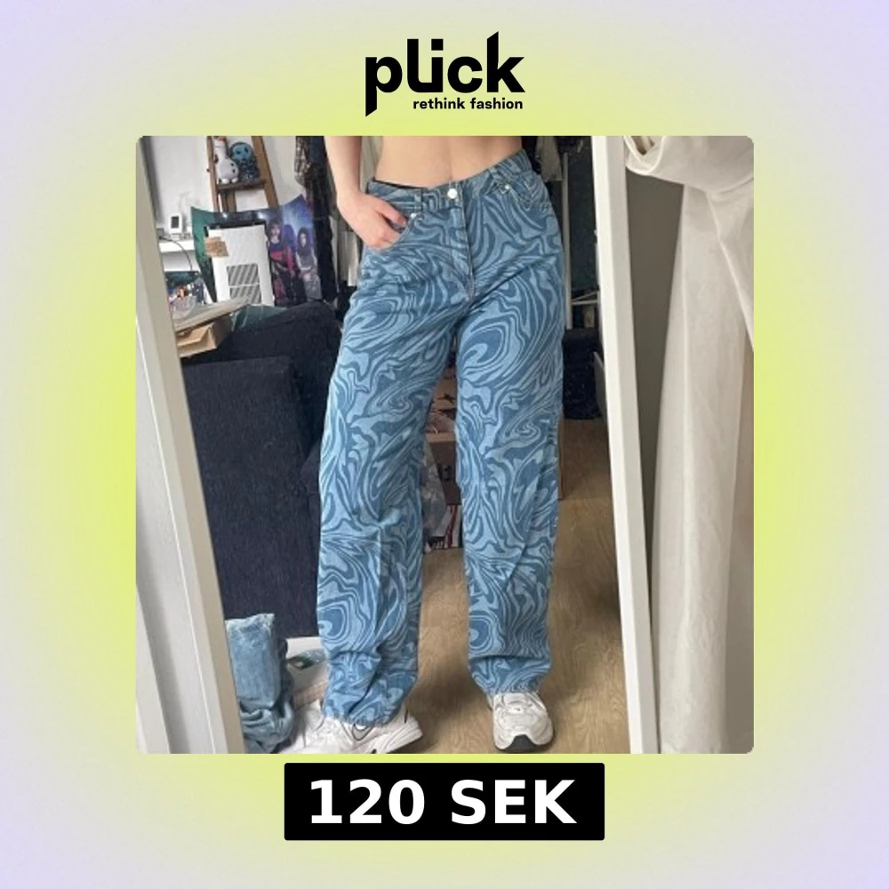 Säljer ett par blå jeans med coolt swirlmönster. Byxorna har en loose/wide passform med raka ben, klassiska fem fickor och knappgylf. Perfekta för dig som vill sticka ut med coola mönster och bekväm stil. Passar baggy på en 36a, men passar även väl på en storlek 38. Aldrig använda, endast provade.