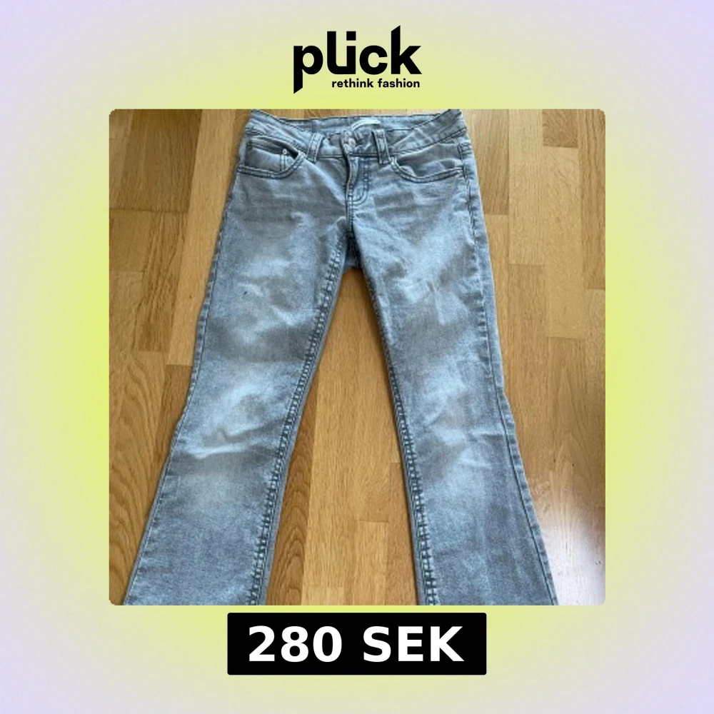 gråa low waist jeans som går utåt längst ner från gina tricot, storlek 38, köptes för ca 400kr, pris kan diskuteras.