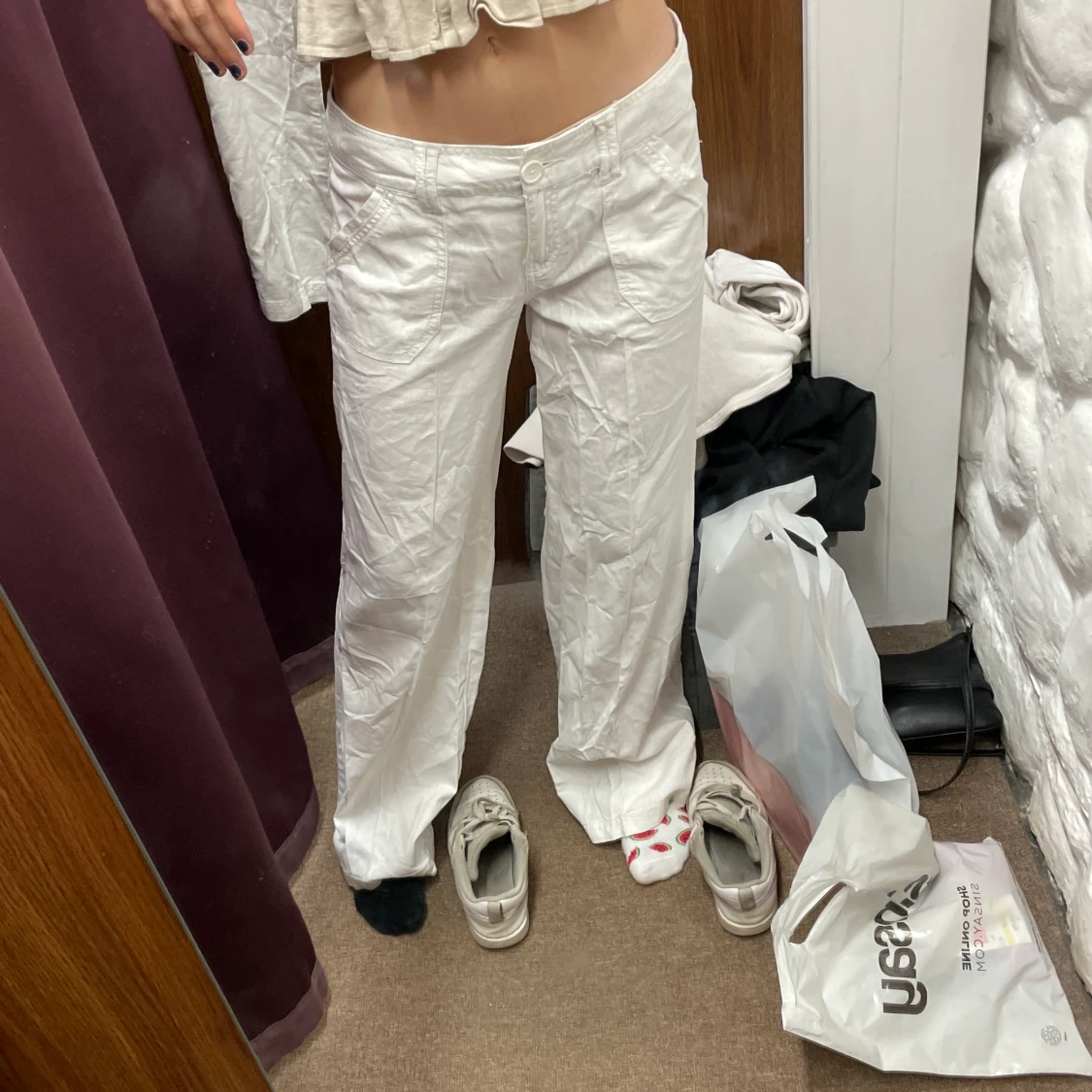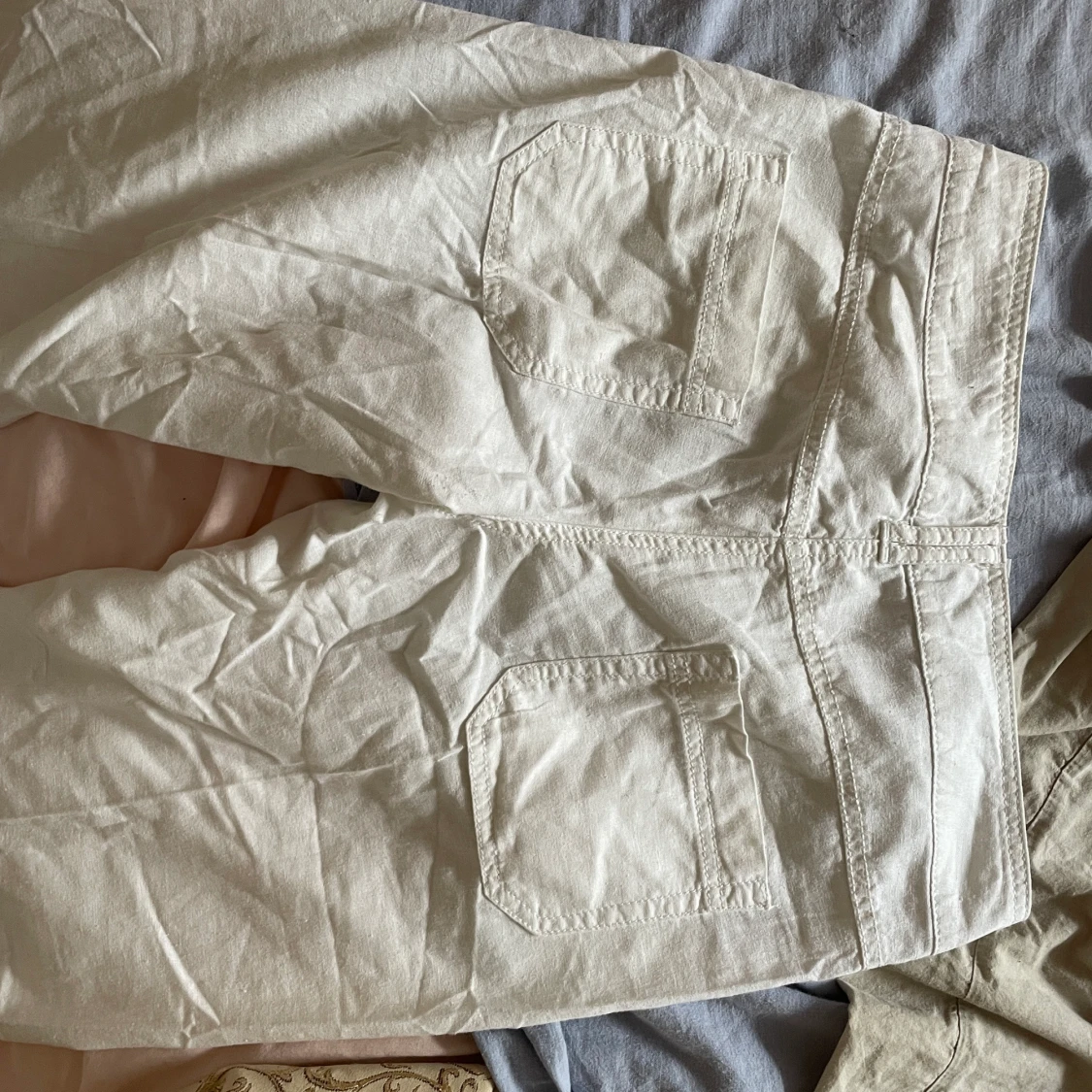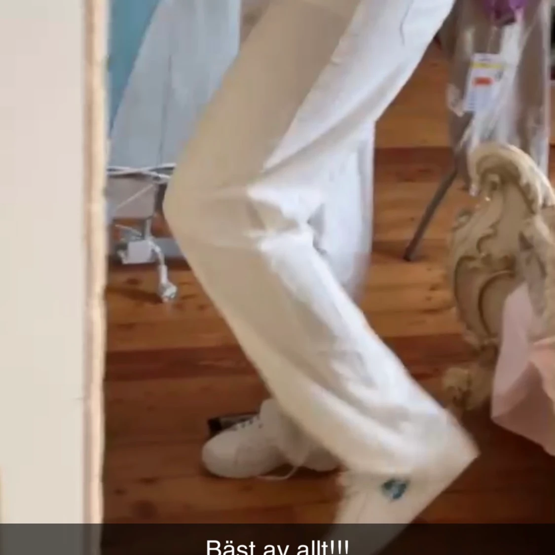 Intresskoll på mina nya vita linnebyxor eftersom jag har två par. Säljer bara vid bra pris. De går precis under naveln på mig men de är lite stora så när jag släpper åker de ner. Storlek 36 men passar både 34 och 38. Långa på mig som är 170 och går över skorna, är man lite kortare så kan man absolut klippa av de en bit. De är raka i modellen och köpta på With love där de nu är slutsålda. Både killar och tjejer kan ha på sig dessa alltså unisex. De ser beiga ut på sista bilden men de är krit vita som man ser på de 2 första. De går även att sprätta upp där nere (8cm) så de passar någon 180cm. Ni får buda i kommentarerna eller skriva privat