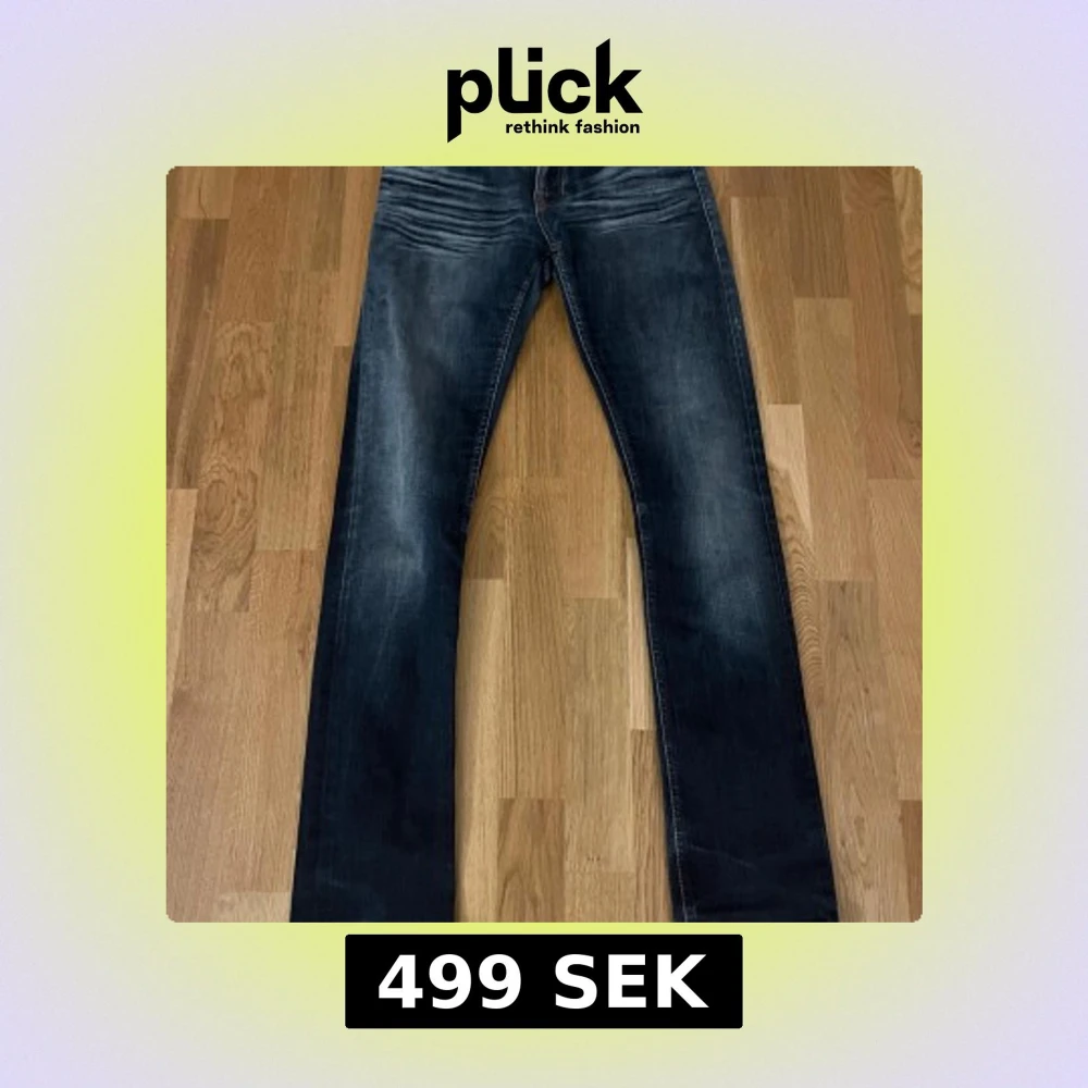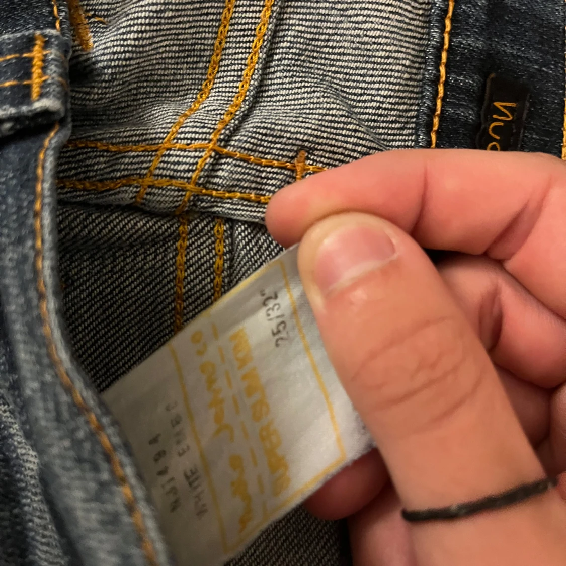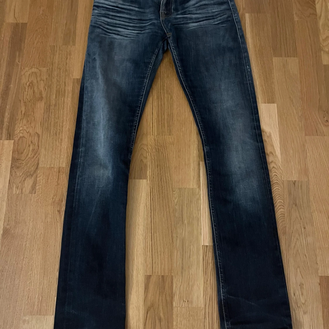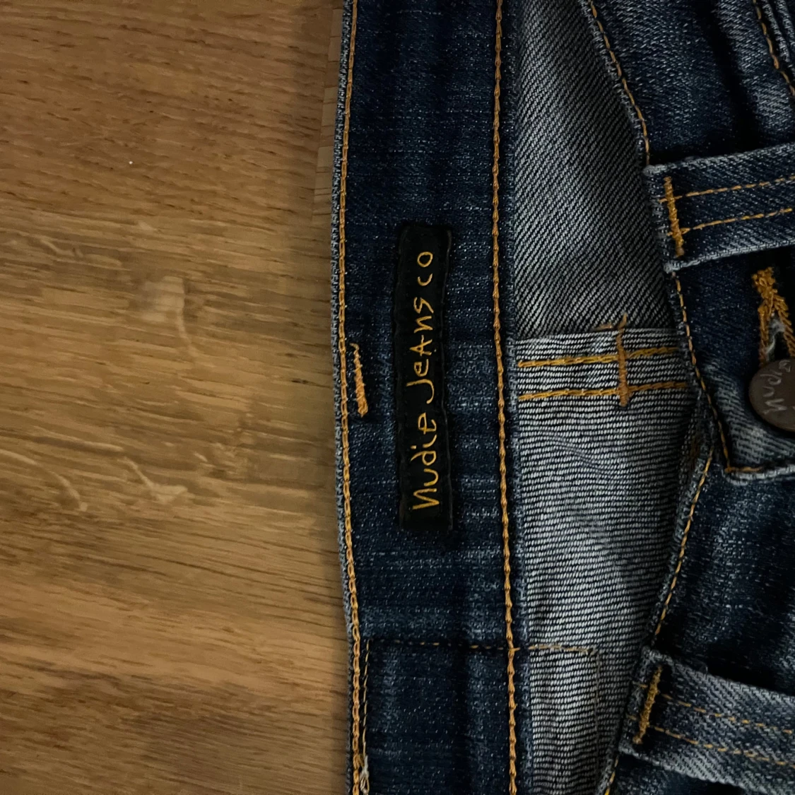 Snygga mörkblå jeans från Nudie Jeans i modellen Super Slim. Jeansen har en smal passform med klassisk femficksdesign och coola slitningar framtill. Materialet är jeans med orangea kontrastsömmar som ger en schysst detalj. Perfekt för dig som gillar en tight look.