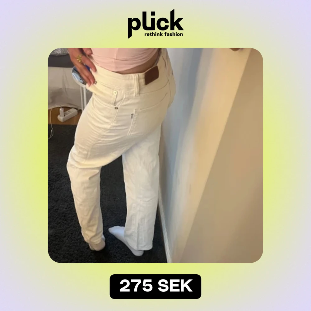 Superfina vita jeans från woodbird🤍💫 Innerbenslängd: 80cm💕 Storlek 34✨ Nypris 900kr⚡️ De ser lite korta ut på bilden eftersom dom är för små för mig, dom ska egentligen gå hela vägen ner🌸