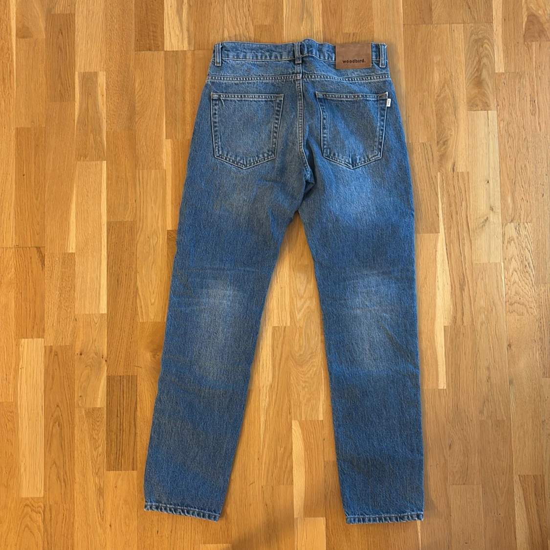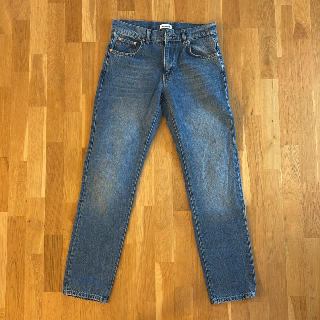 Säljer ett par snygga blå vintage jeans från Woodbird i storlek 29/32. De har en klassisk straight fit och är i mycket bra skick. Perfekta för både vardag och fest! 🕺