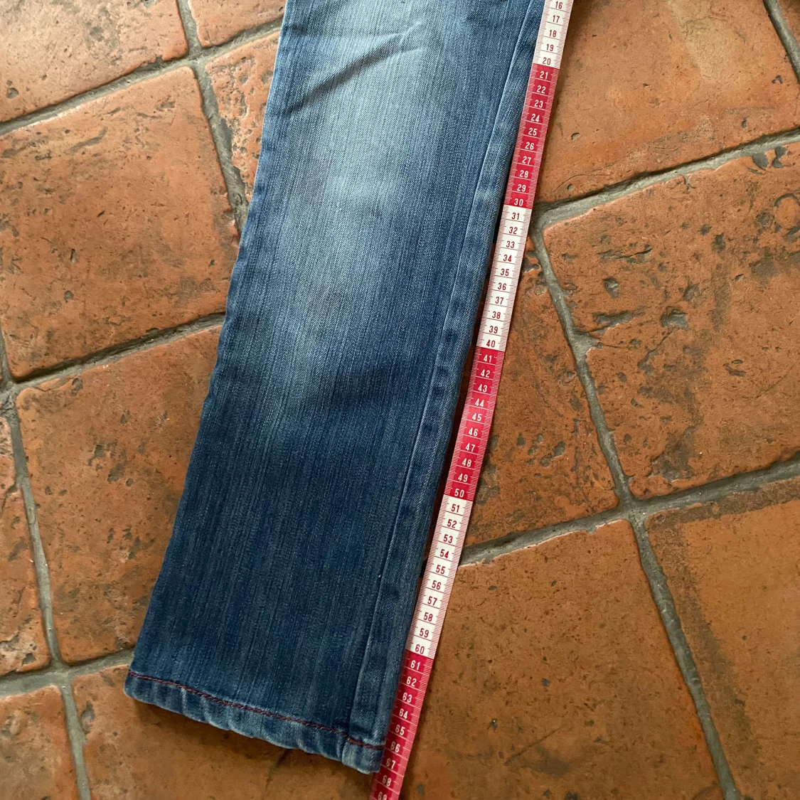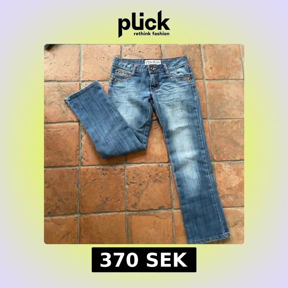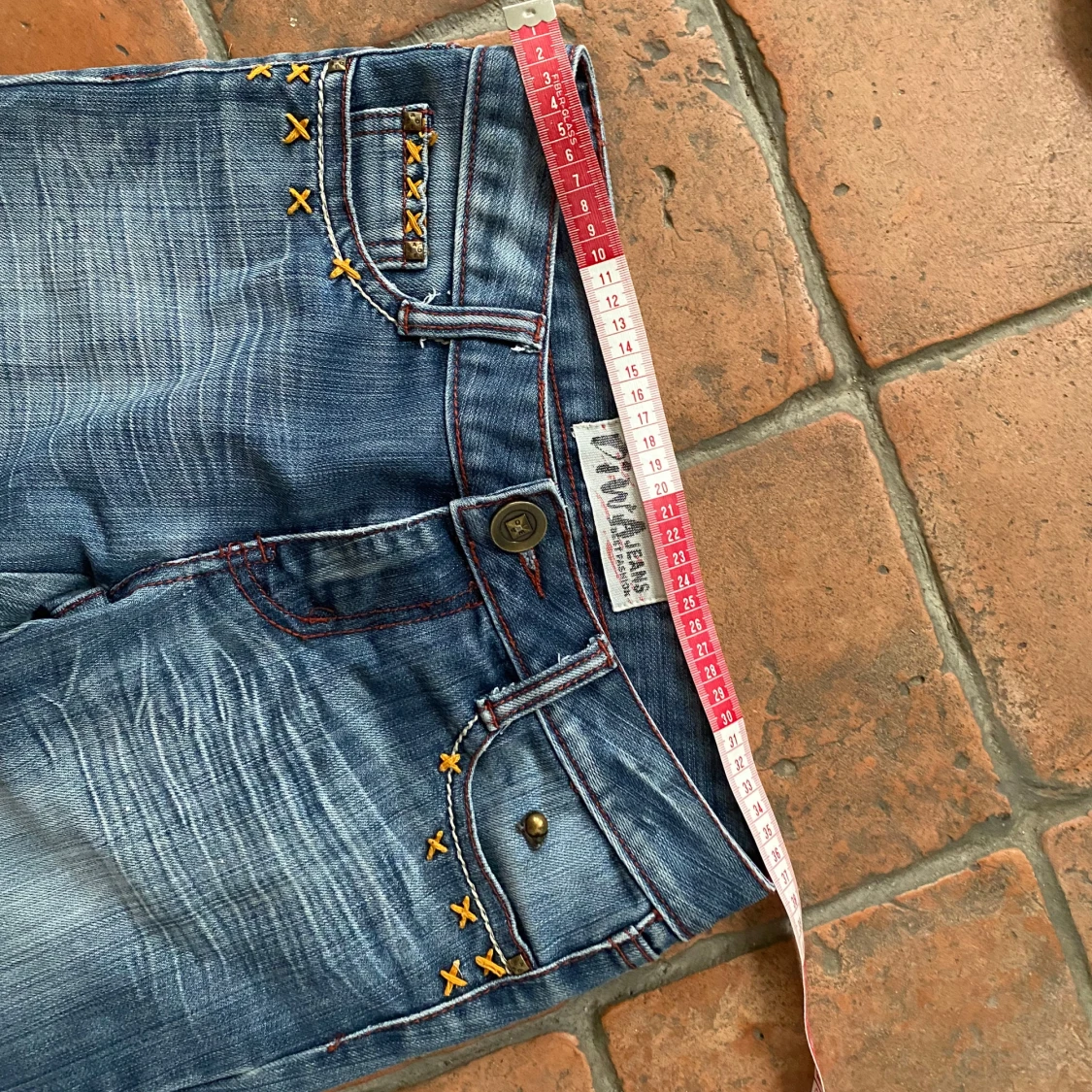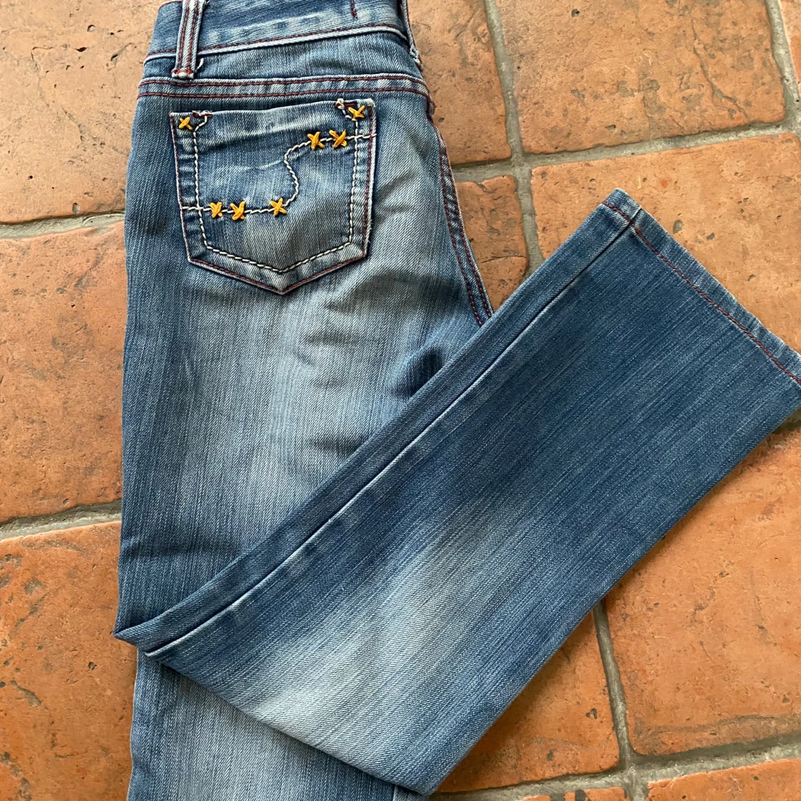 Snygga blå jeans med unika broderade detaljer i gult på fickorna. Jeansen har en flare passform och är perfekta för en avslappnad stil. Aldrig andvänt och köpt på Vinted. Kan inte skicka bild på då de inte passar! Midjemått:37 Innerbenslängd:69