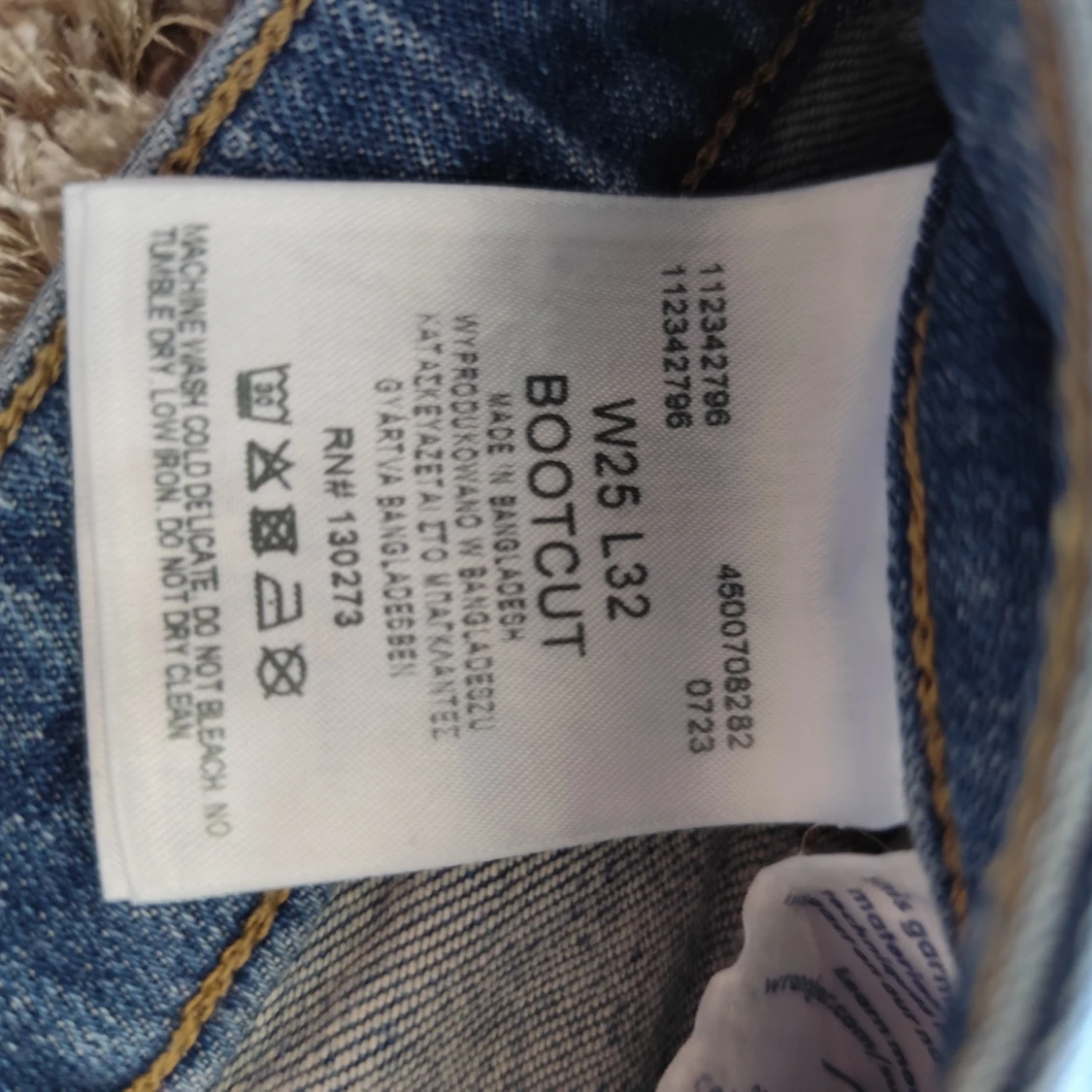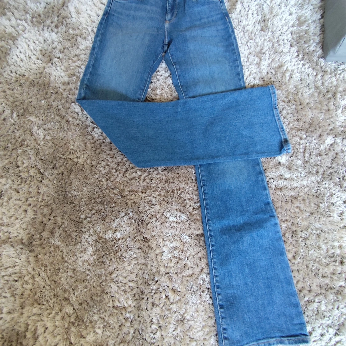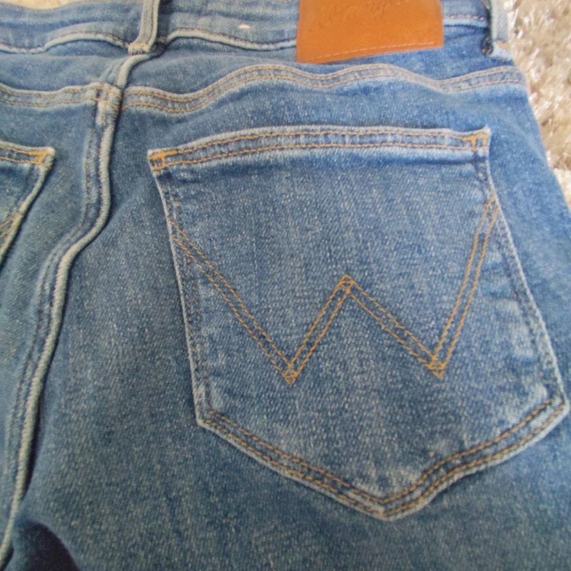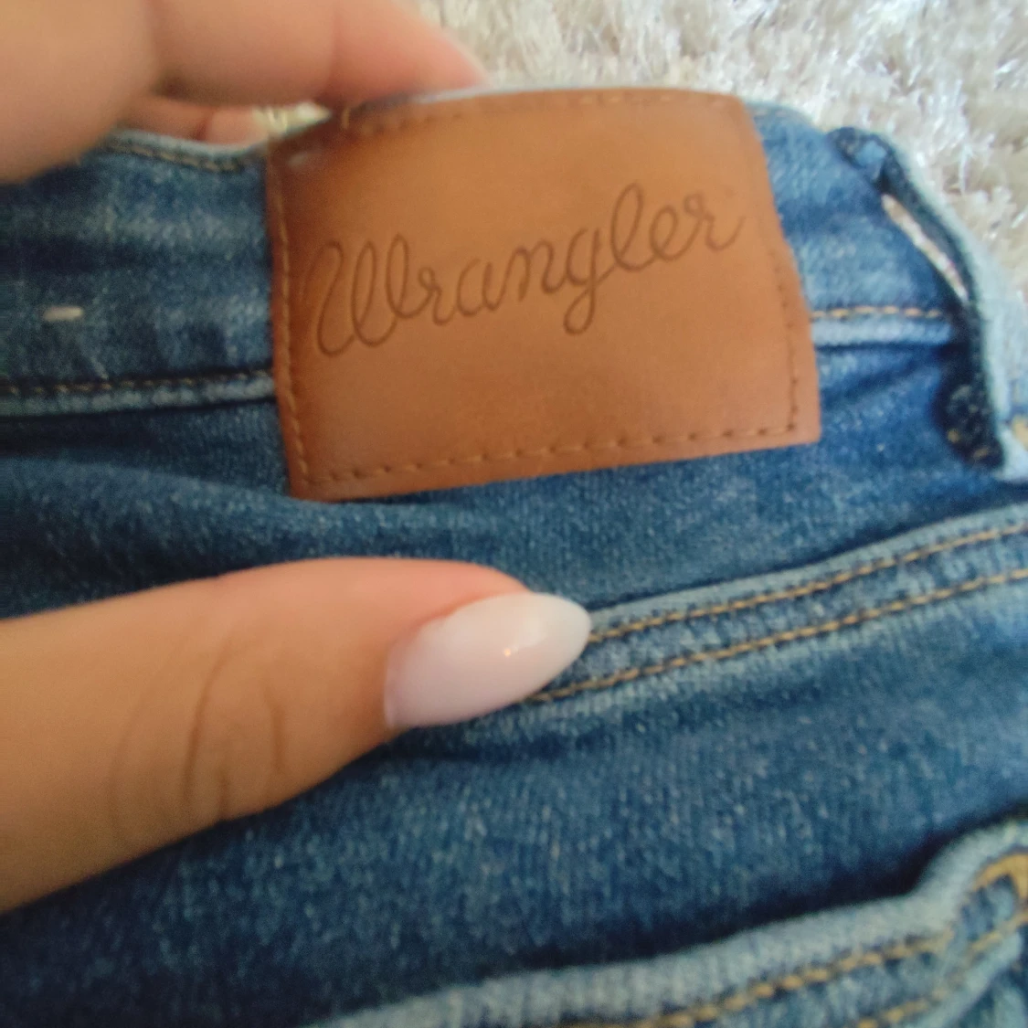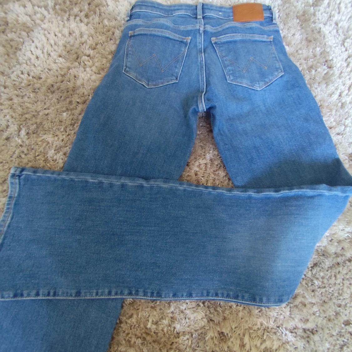Säljer ett par klassiska blå jeans från Wrangler med bootcut passform. Jeansen har hög midja, snygga bakfickor med ikonisk W-söm och läderpatch med logga. Tillverkade i slitstarkt denim och perfekta för dig som gillar en tidlös look.