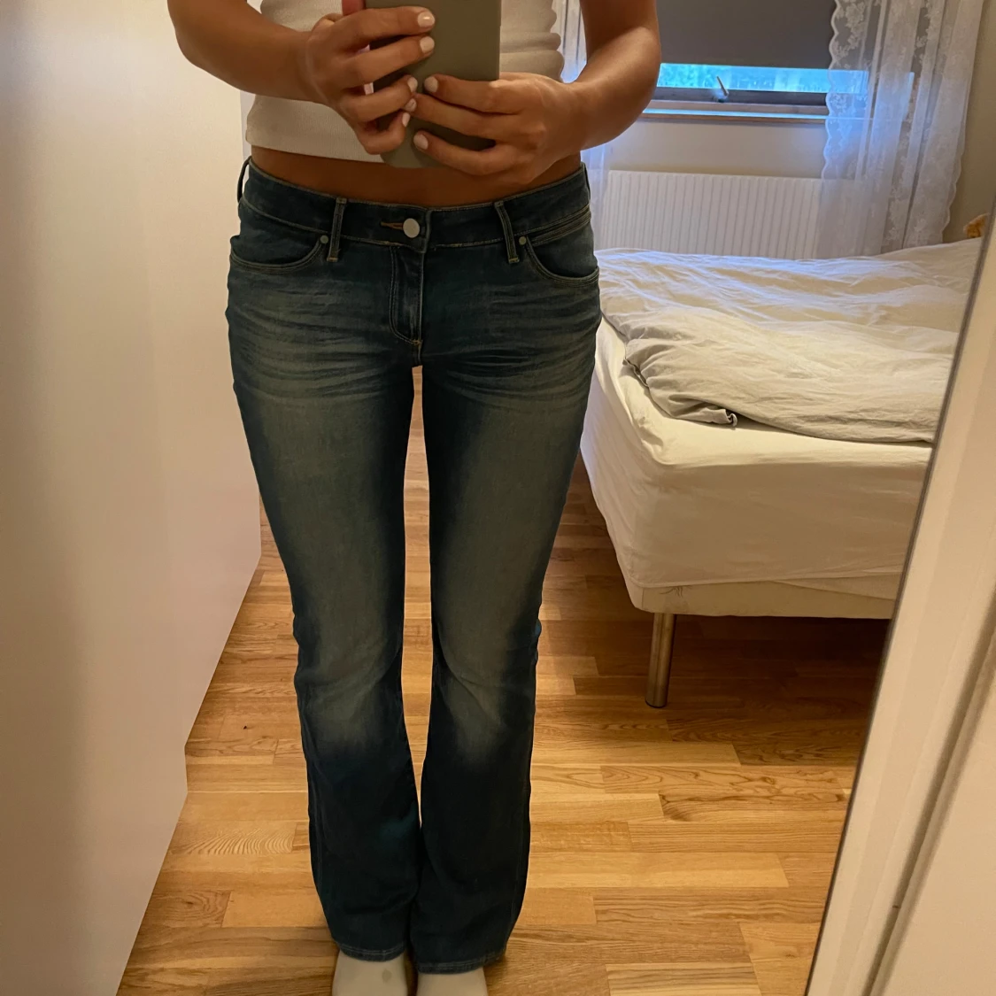 Säljer ett par supersnygga blå bootcut jeans från wrangler med låg midja. Jeansen har extra detalj på låren för att ge en cool effekt 🩵 Jeansen är stretchiga vilket betyder att de kan passa flera storlekar, säljer då dem tyvärr är för stora för mig ☺️Storleken är W29 L32