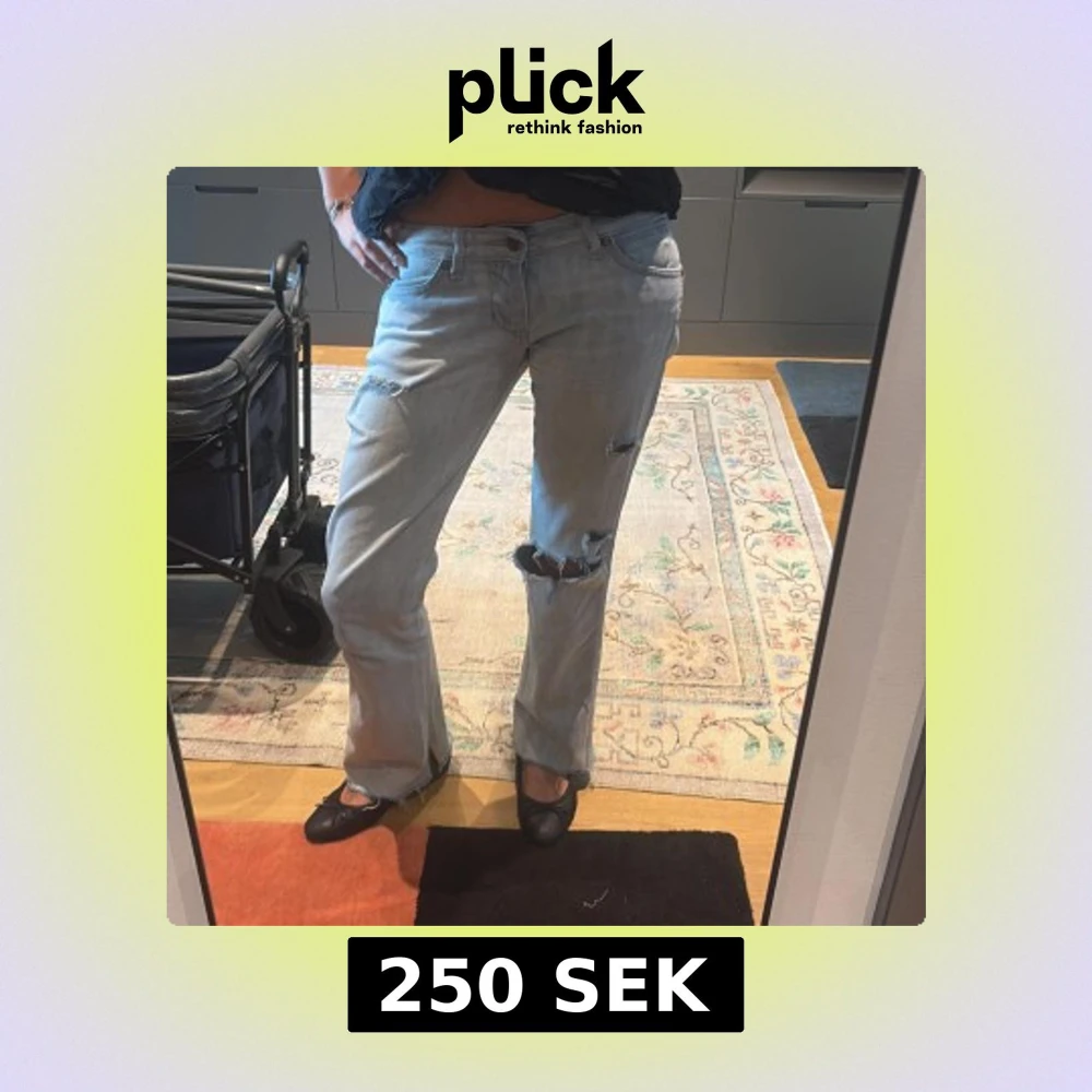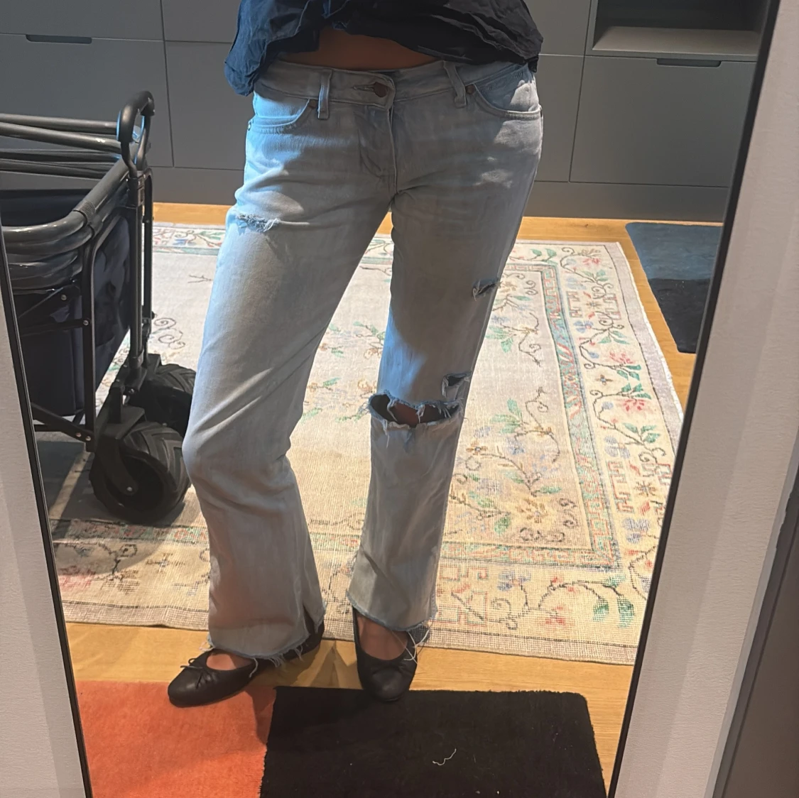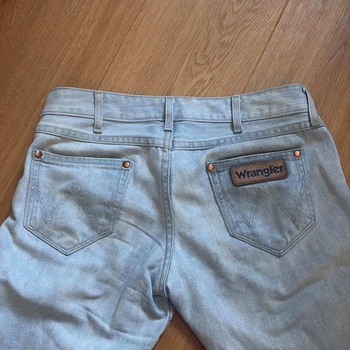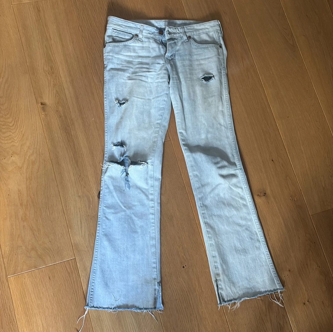 Ljusblå jeans från Wrangler med bootcut passform och råa, fransiga benslut. Jeansen har flera slitningar och hål på benen för en edgy look. Klassisk femficksmodell med låg midja och Wrangler-logga på bakfickan. Perfekta för dig som gillar vintagevibbar. Använda en del, där av lite slitna ner.