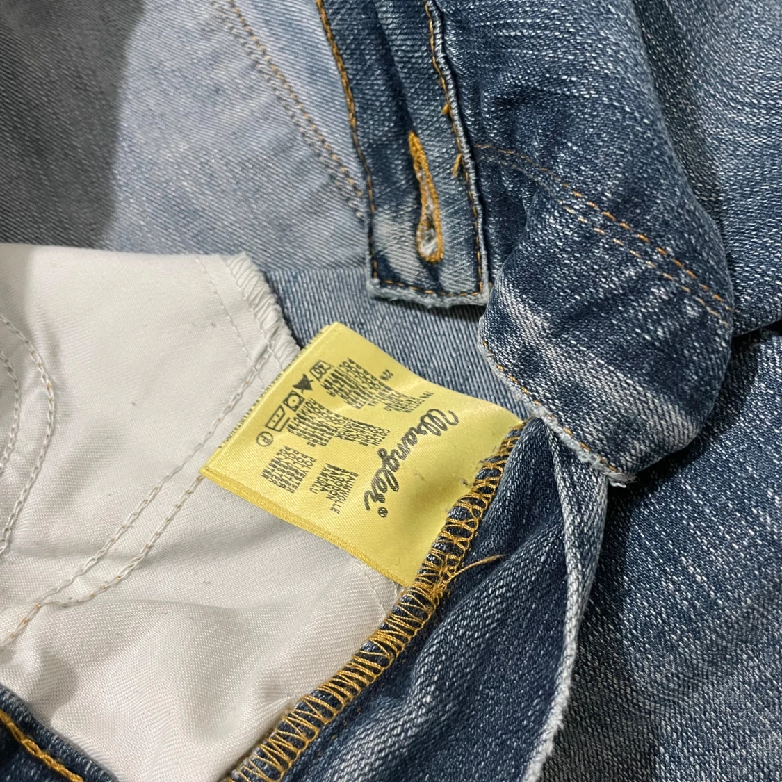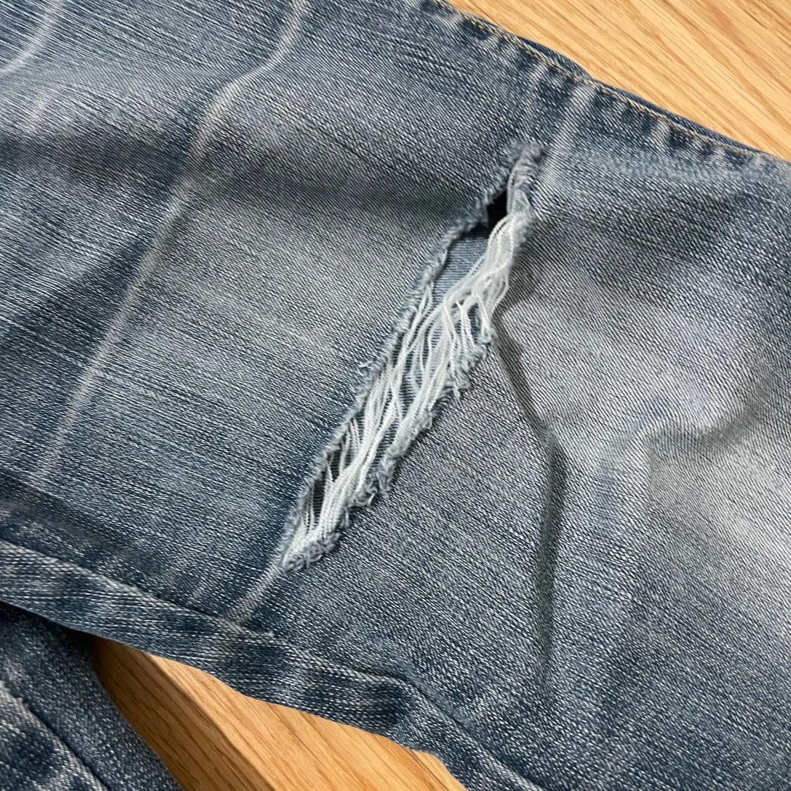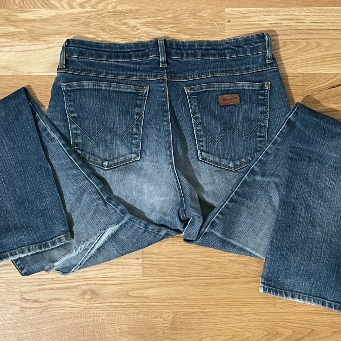Säljer ett par klassiska blå jeans från Wrangler. De har en straight passform och ett hål vid frambentet.