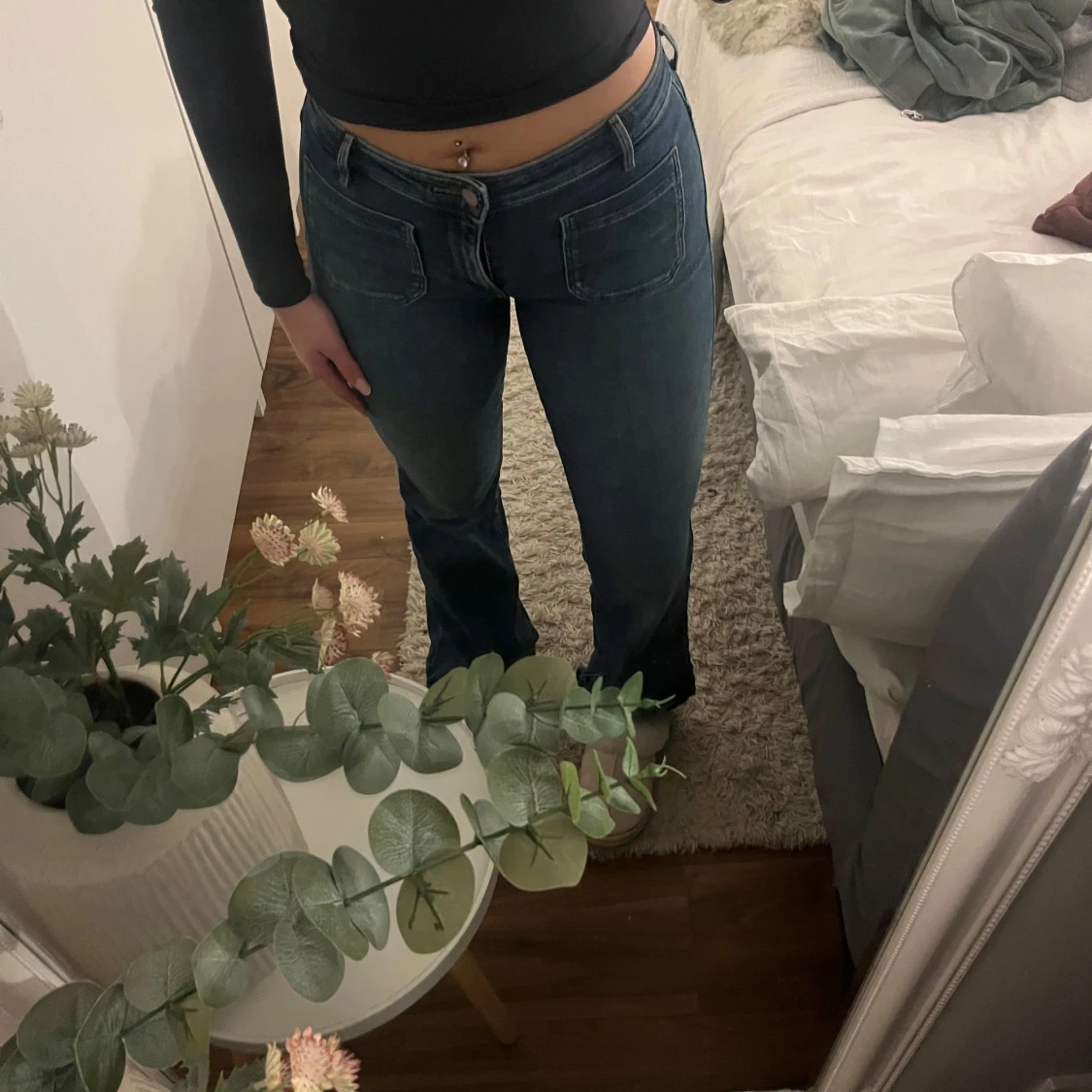 Snygga blå jeans med bootcut-modell och stora framfickor. Jeansen har låg midja och raka ben som slutar i en lätt utsvängning. Klassisk denim med tydliga sömmar och en patch bak på ena fickan. Perfekta för en avslappnad och trendig look.