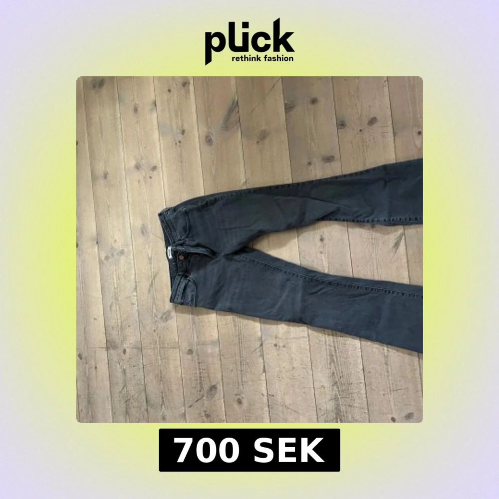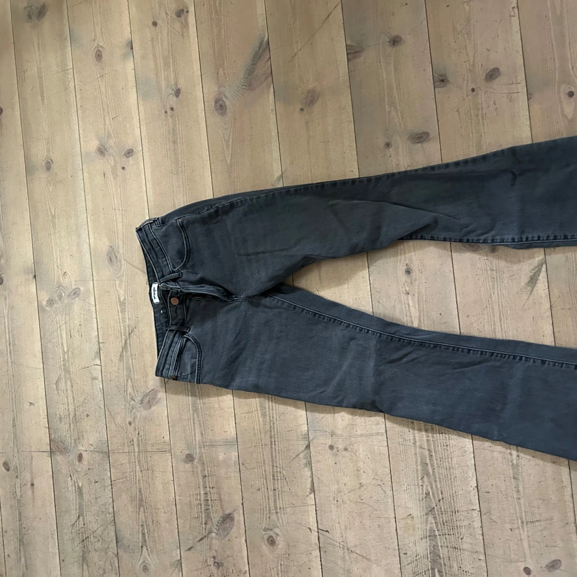 Säljer ett par svarta jeans från Wrangler med klassiska W-sömmar på bakfickorna. Modellen har bootcut-ben och normal passform. Jeansen är tillverkade i bomull och har en snygg, mörk tvätt som passar till det mesta. I ny skick då de inte passar