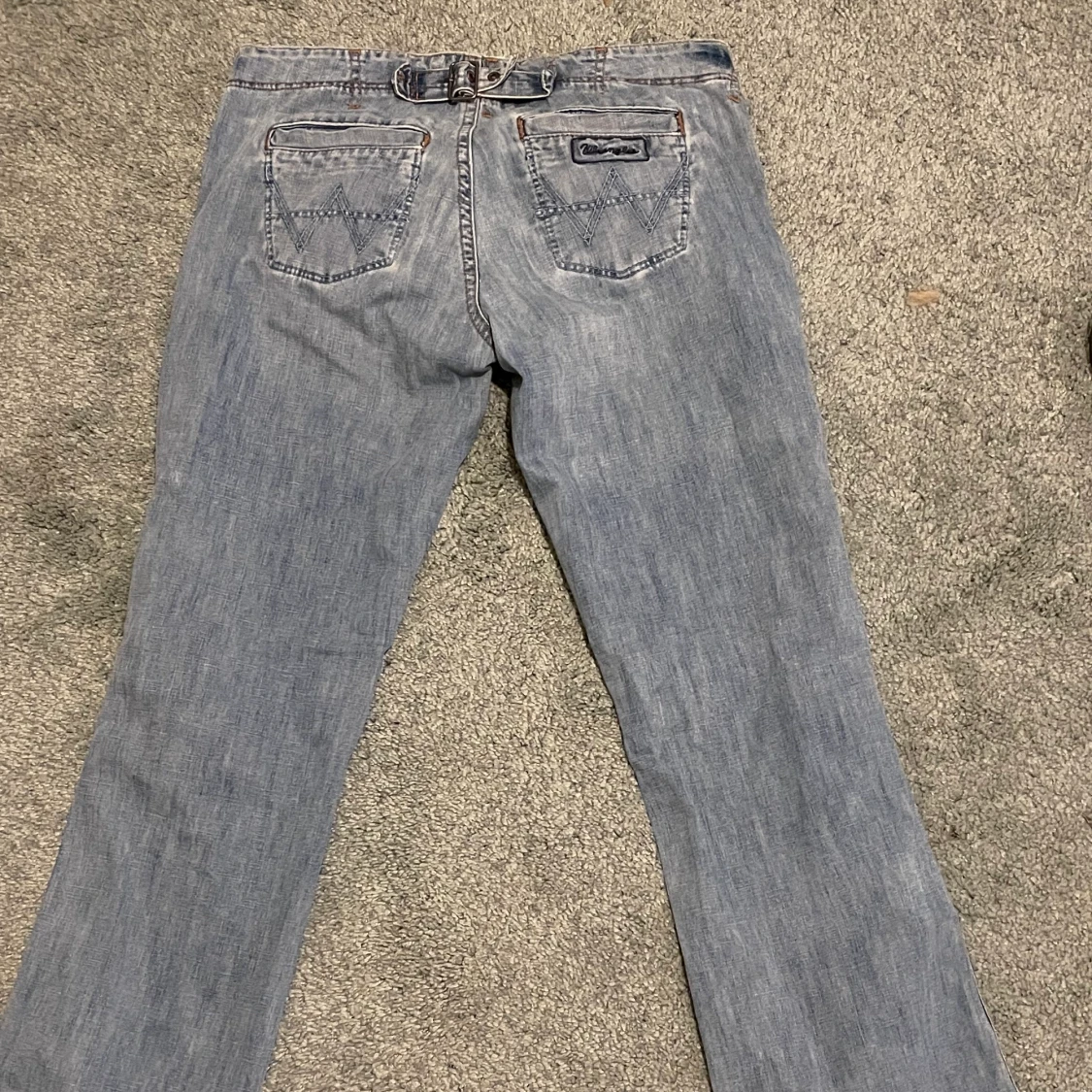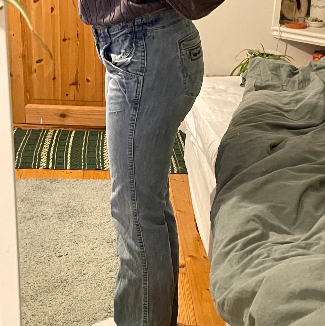 De snyggaste lågmidjade jeansen någonsin från wrangler!!! De är troligtvis vintage! Jag är 166cm och dem går lite under foten på mig. Sååå coola fickor bak och det går även att spänna åt dem. Dem är i väldigt bra skick förutom lite slitningar längst ner på benet. Säljer för att de inte kommer till användning😋