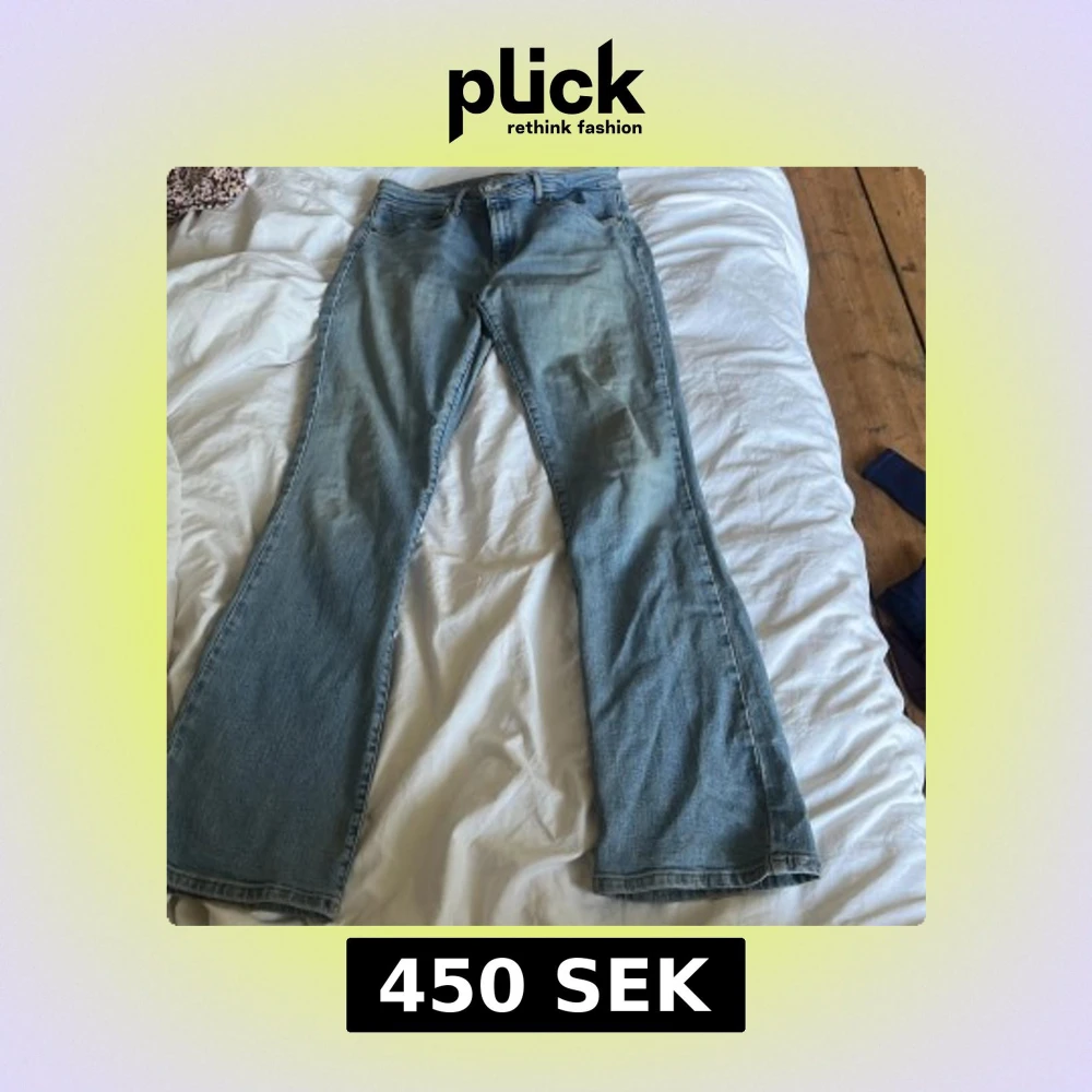 Säljer ett par klassiska ljusblå bootcut jeans från Wrangler. Jeansen har snygga bakfickor med W-detalj, normal passform och är tillverkade i bomull. Perfekta för dig som gillar retrovibbar och vill ha ett par jeans med lite utsvängda ben. Köptes för 1500, på bild 3 ser man de som är negativt men de är de enda och eftersom de är ett dyrt märke så säljer ja de för de priset.