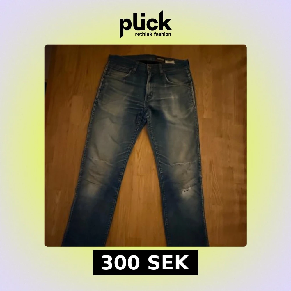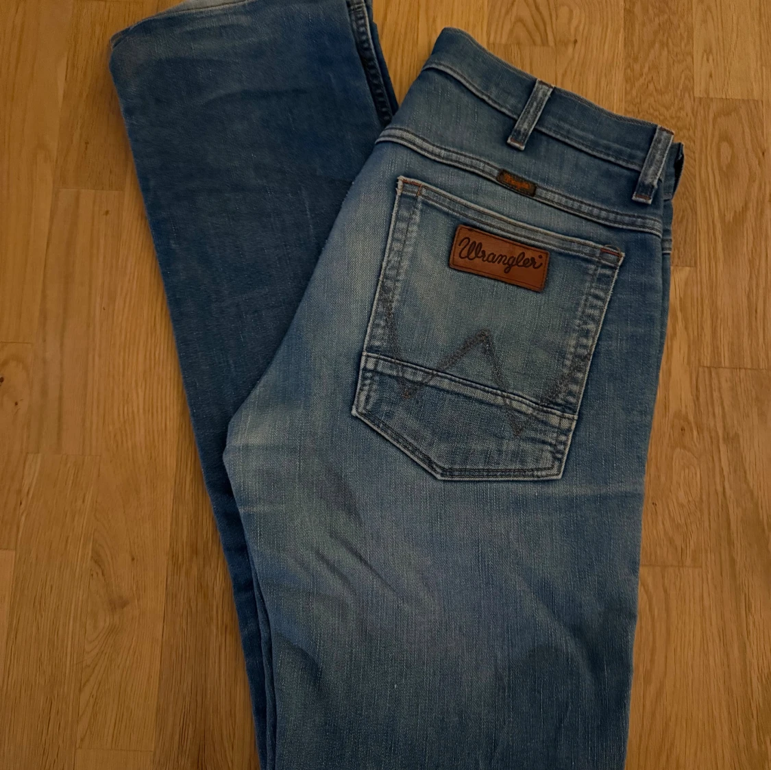 Säljer ett par blå jeans från Wrangler ”Greenborg” med snyggt slitna detaljer och ljus tvätt. Klassisk femficksmodell med läderpatch på bakfickan och raka ben. Perfekta för dig som gillar en avslappnad och trendig look.