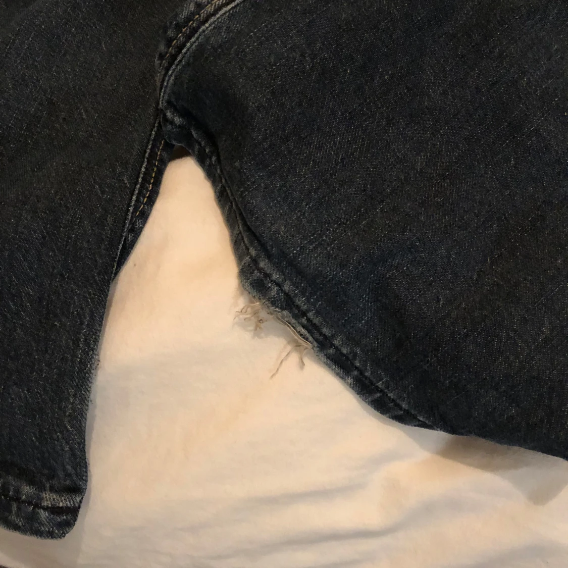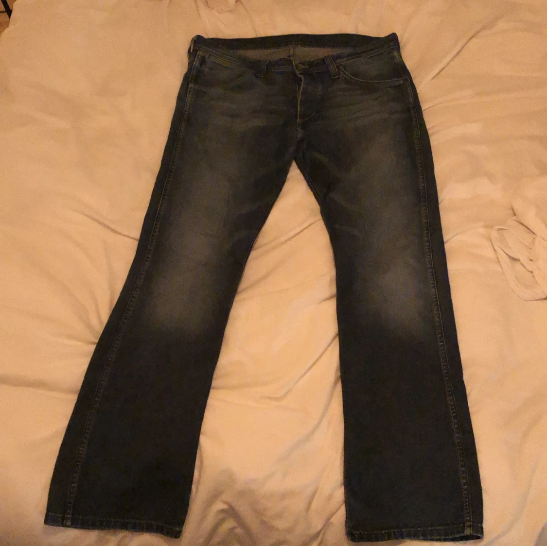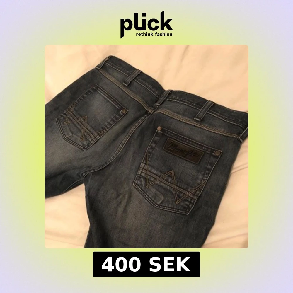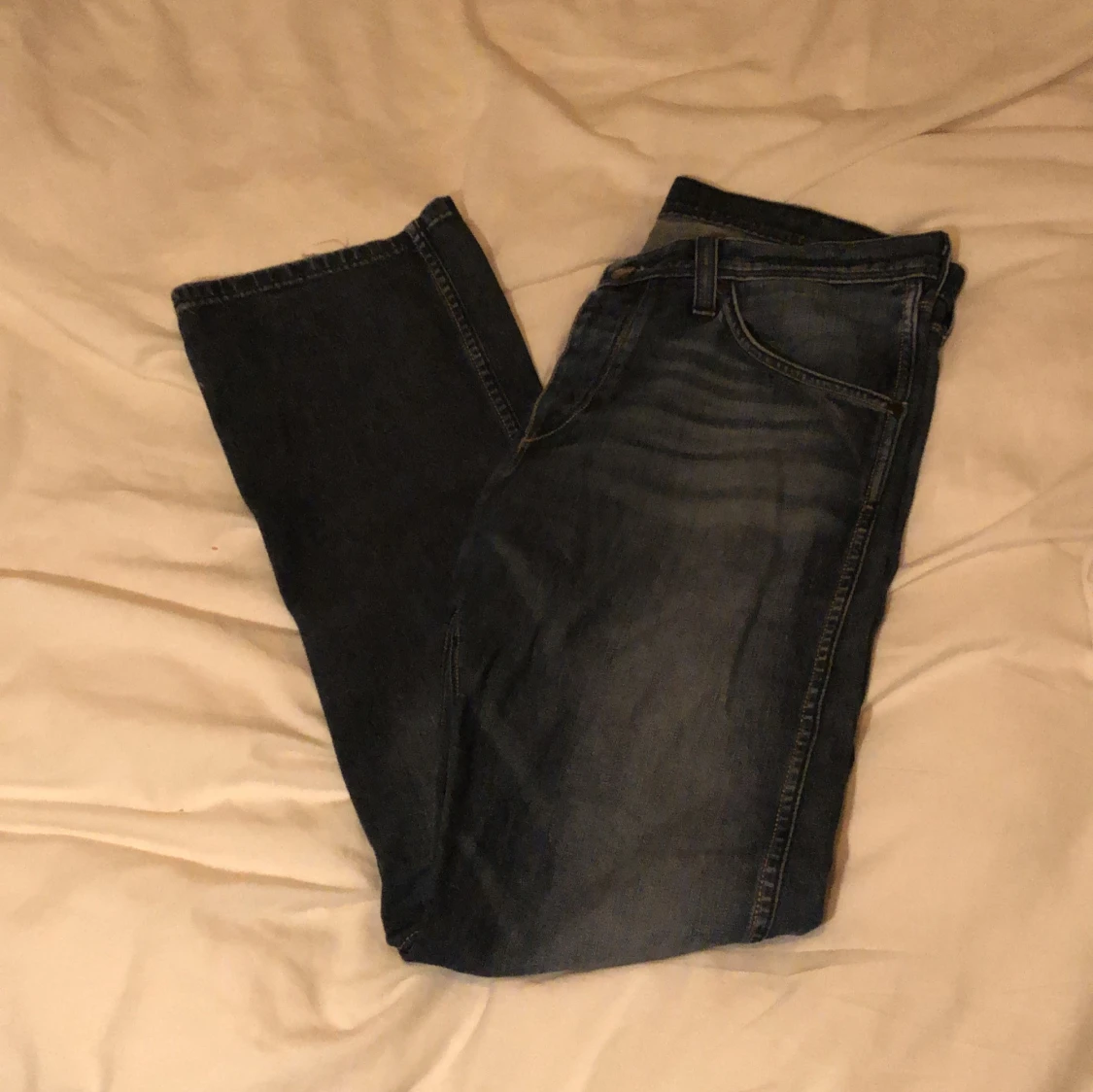 Snygga mörkblå jeans från Wrangler med klassiska kontrastsömmar och broderade bakfickor. Modellen har raka ben och normal passform. Väldigt bra skick utöver en lite slitning längst ner på ena benet
