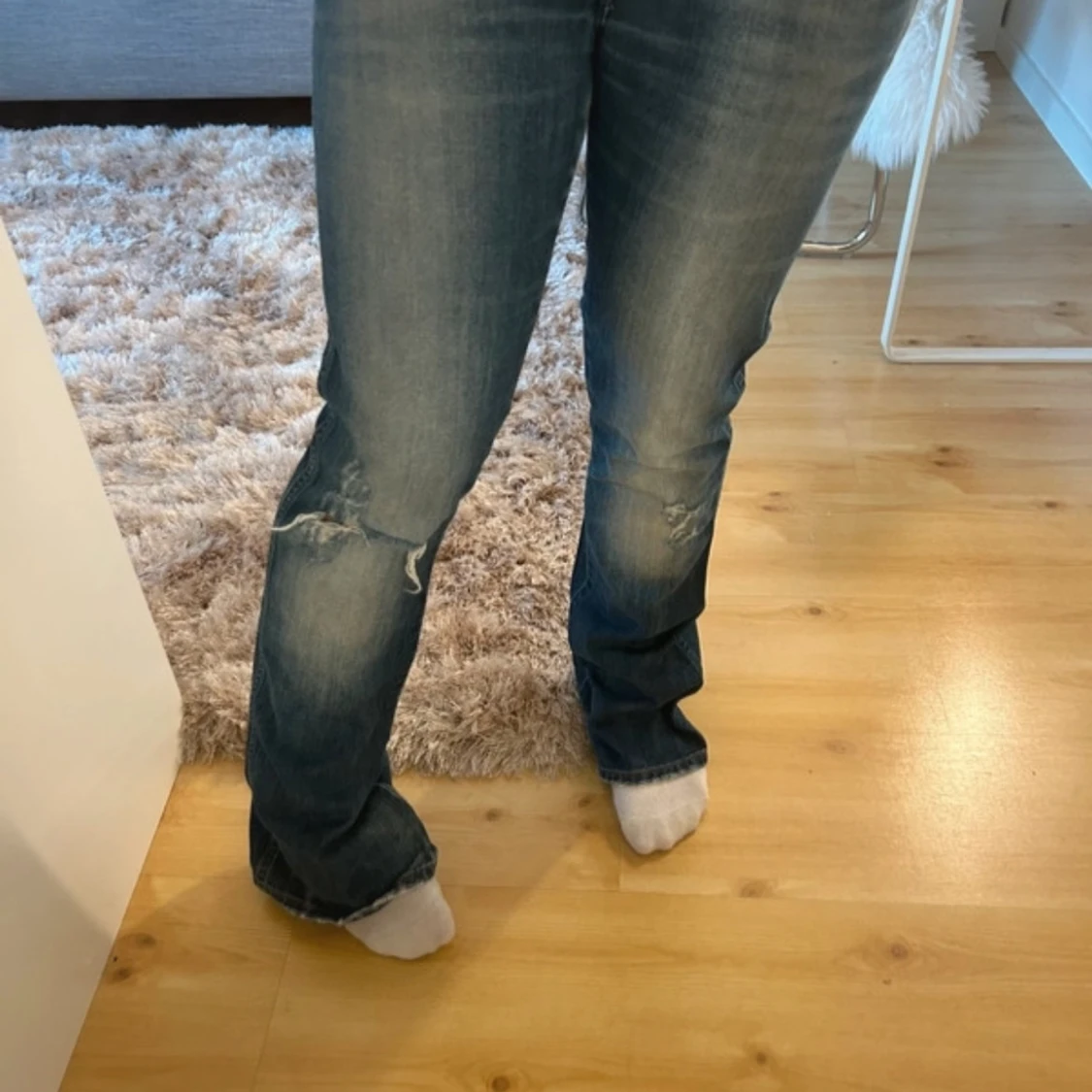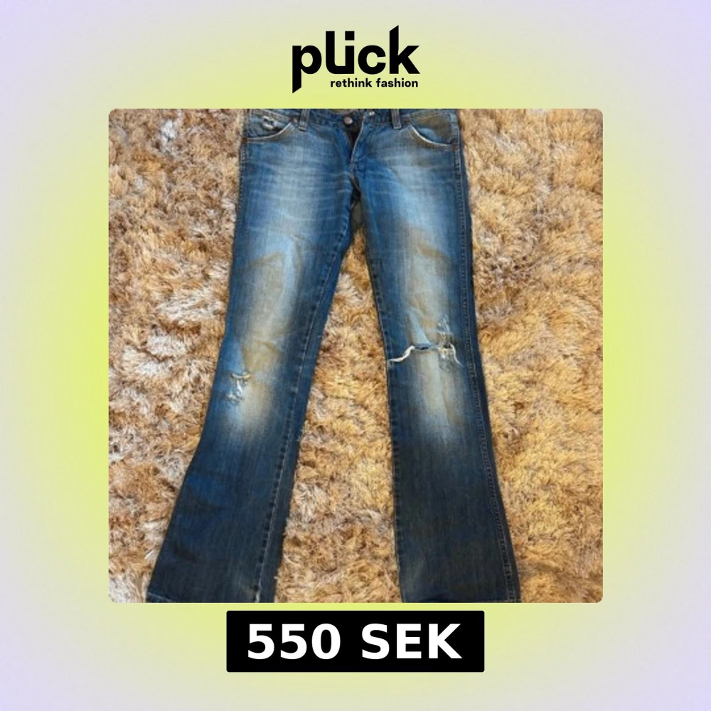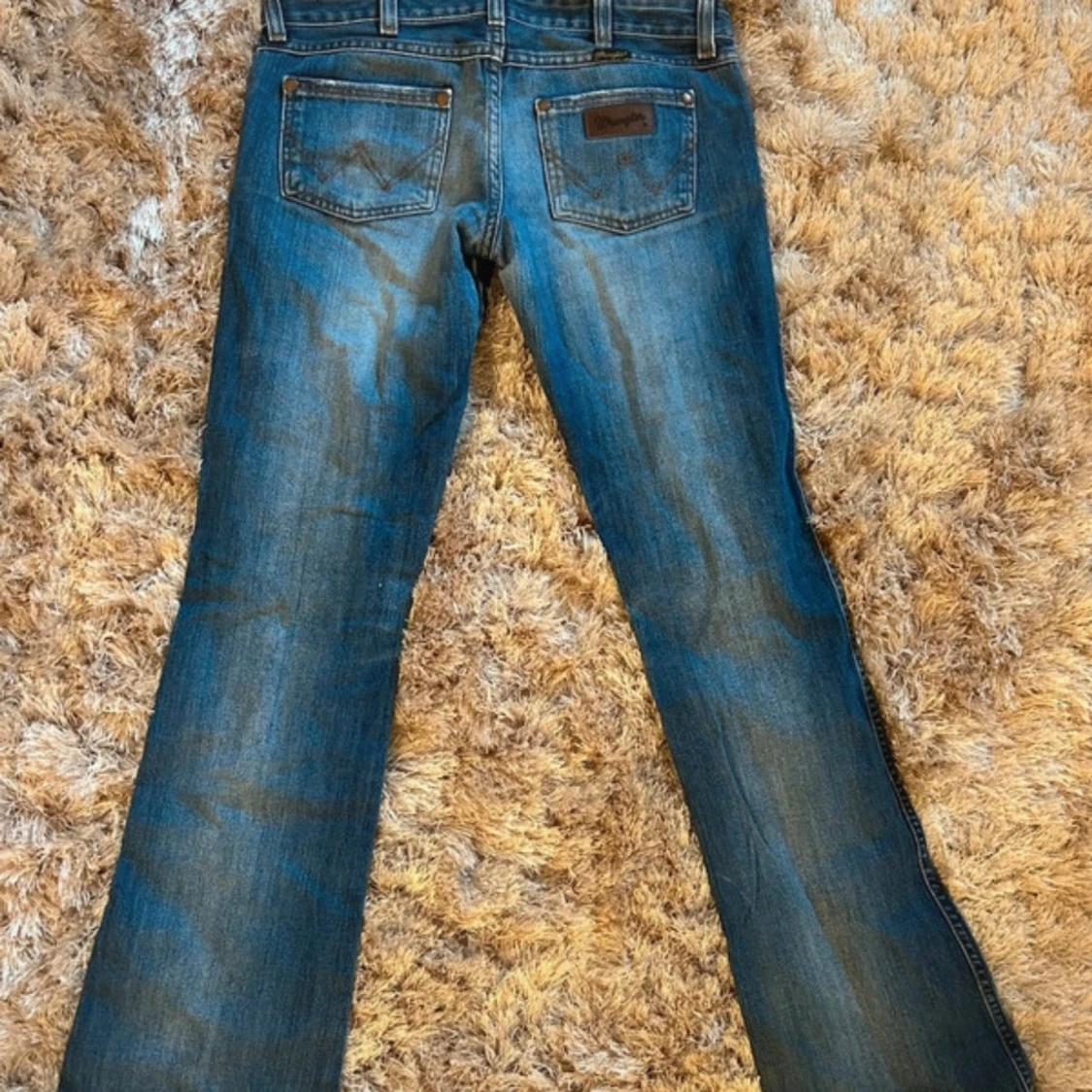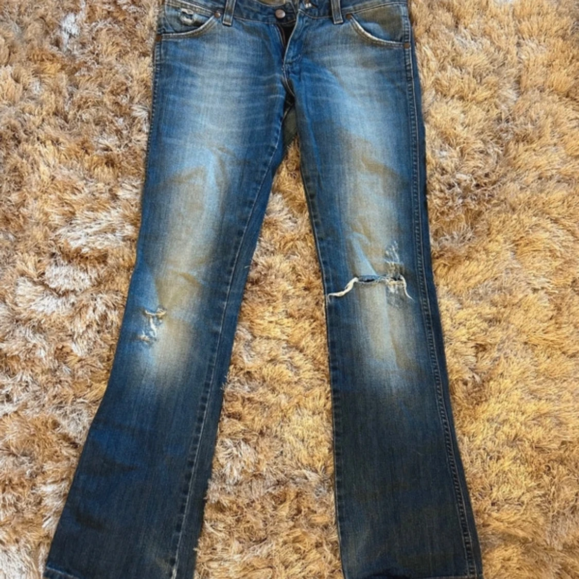 Sååå snygga Bootcut jeans från Wrangler med hål på knät. Är lite slitna där nere som syns. Finns ej bättre bilder på då de är för små för mig!midja: 39 innerben: 81 midjehöjd: 19