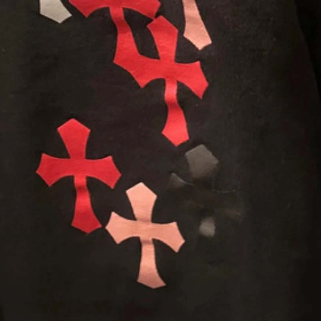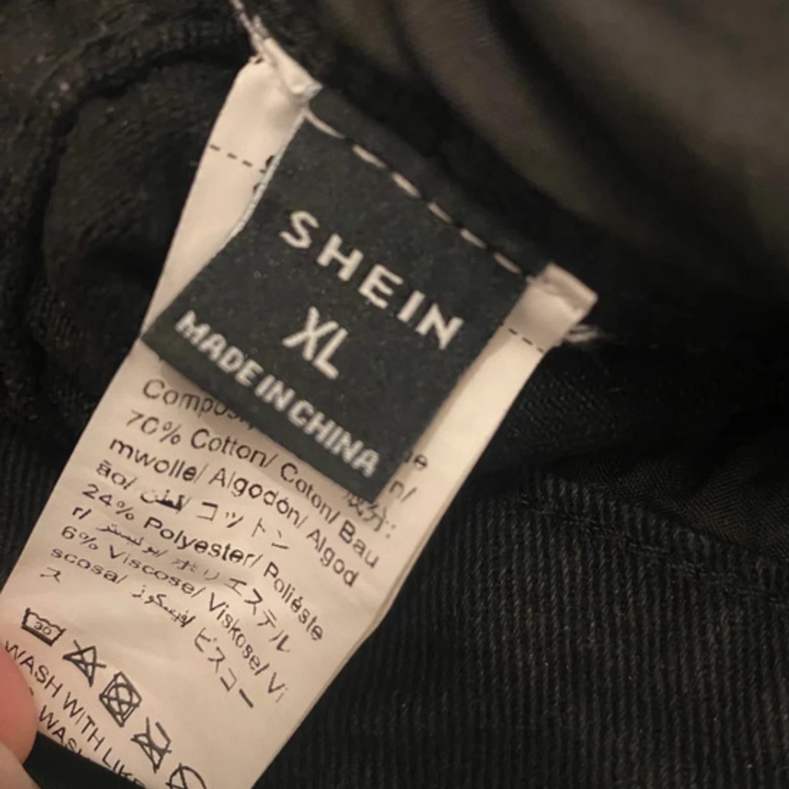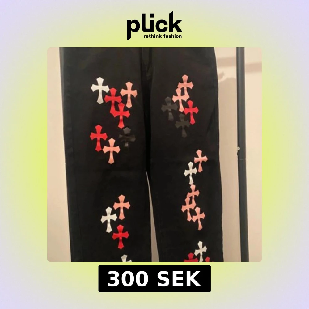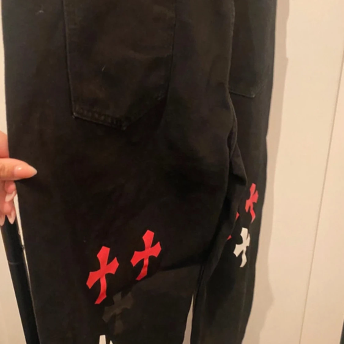 Svarta byxor från Shein i storlek XL med coola korsmönster i rött, vitt, rosa och svart längs benen. Materialet är en mix av bomull, polyester och viskos. Byxorna har raka ben och fickor bak, perfekt för dig som gillar statement-plagg.