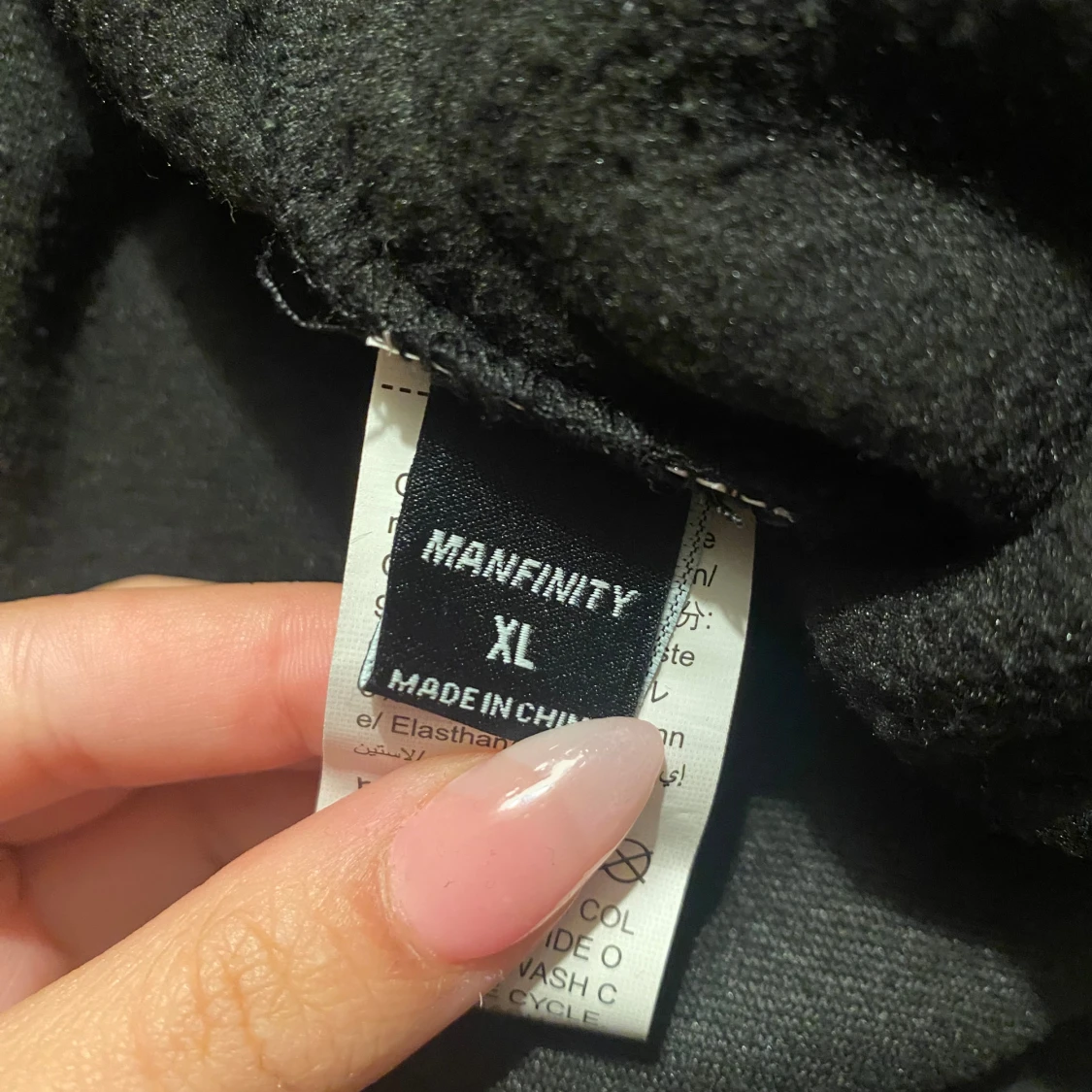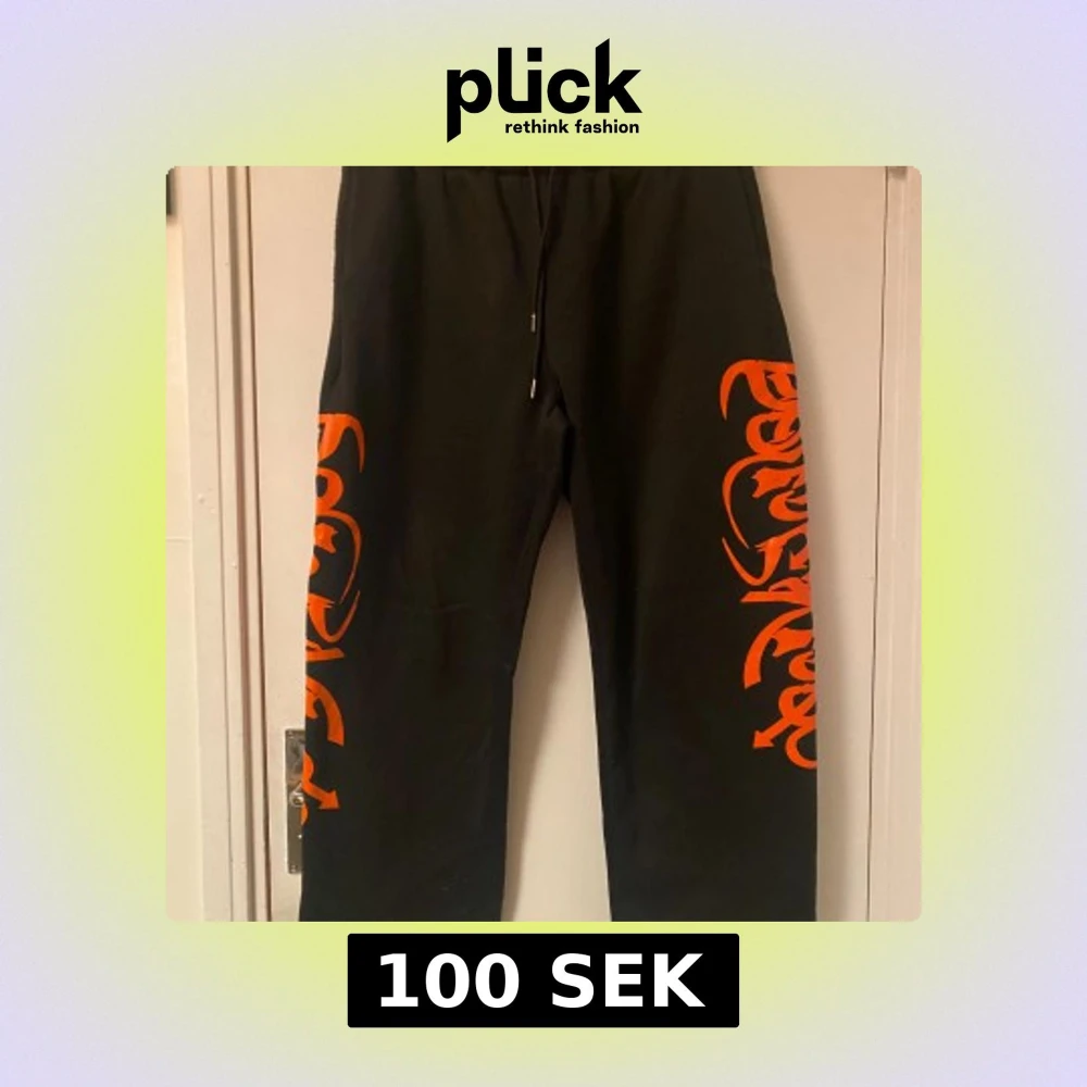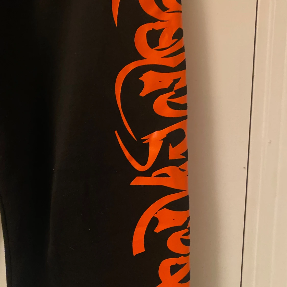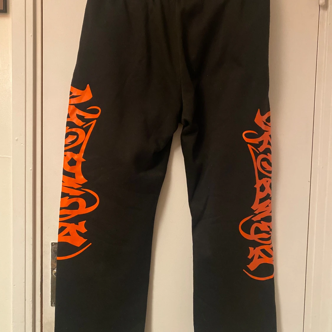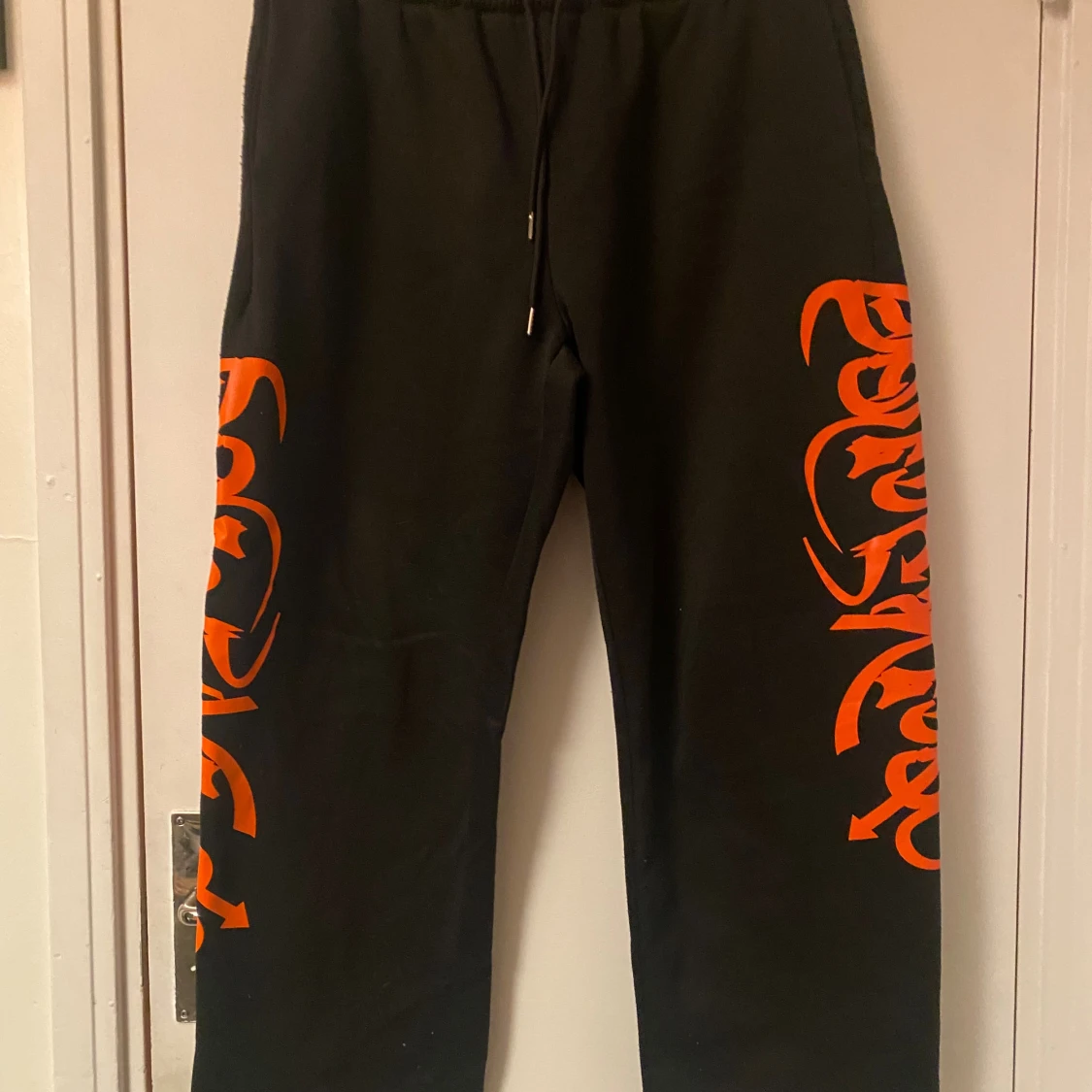 Svarta mjukisbyxor från Manfinity i storlek XL med feta orangea tryck längs båda benen. Byxorna har dragsko i midjan och är gjorda i mjukt material, perfekta för chill eller streetwear. Snygg kontrast mellan svart tyg och det orangea mönstret.