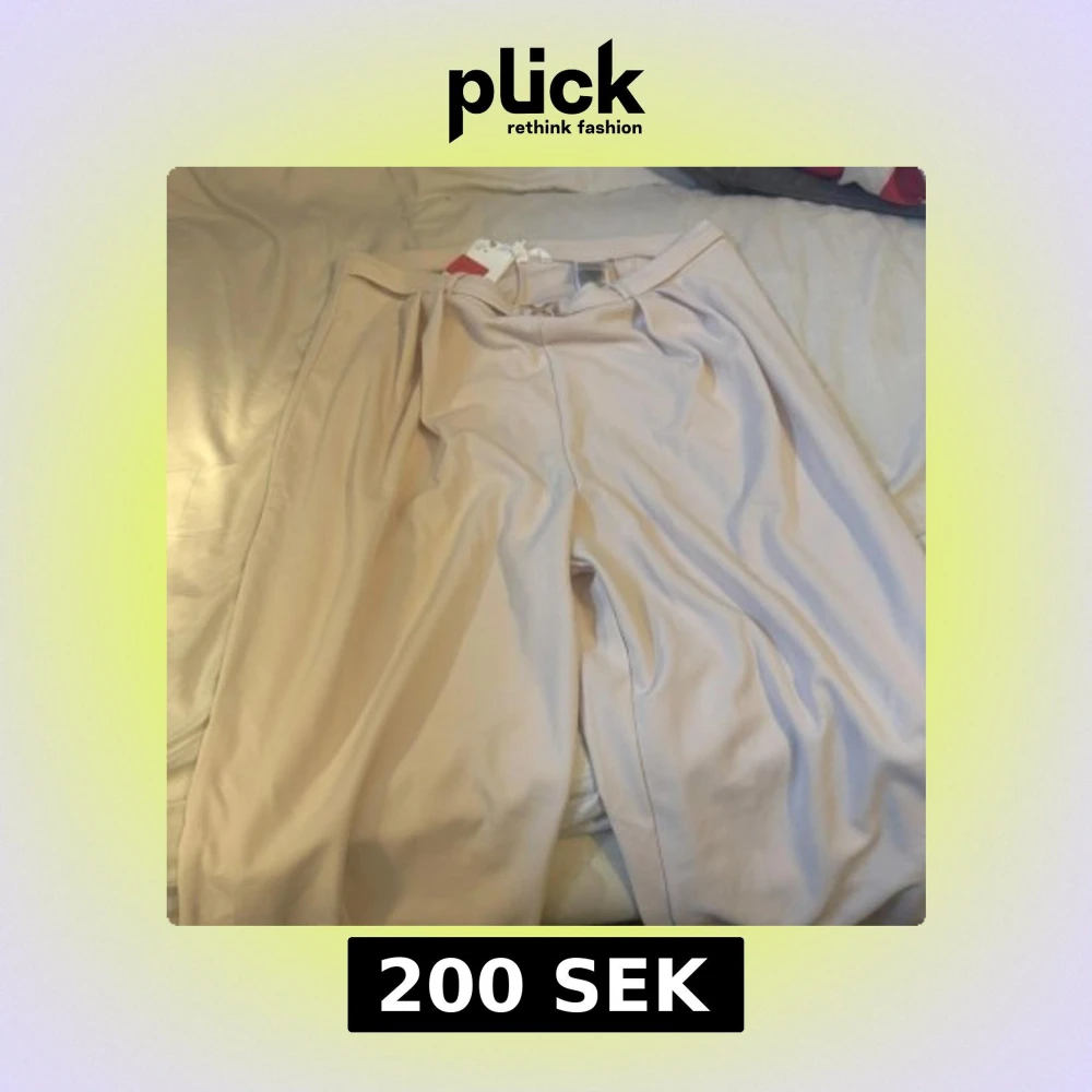 Stilrena beige kostymbyxor från Hm med vida ben och snyggt bältedetalj framtill i silver. Byxorna har hög midja och är perfekta för en clean och trendig look. Sköna och lätta att matcha med både sneakers och boots. Den är inte använd prislapp kvar .