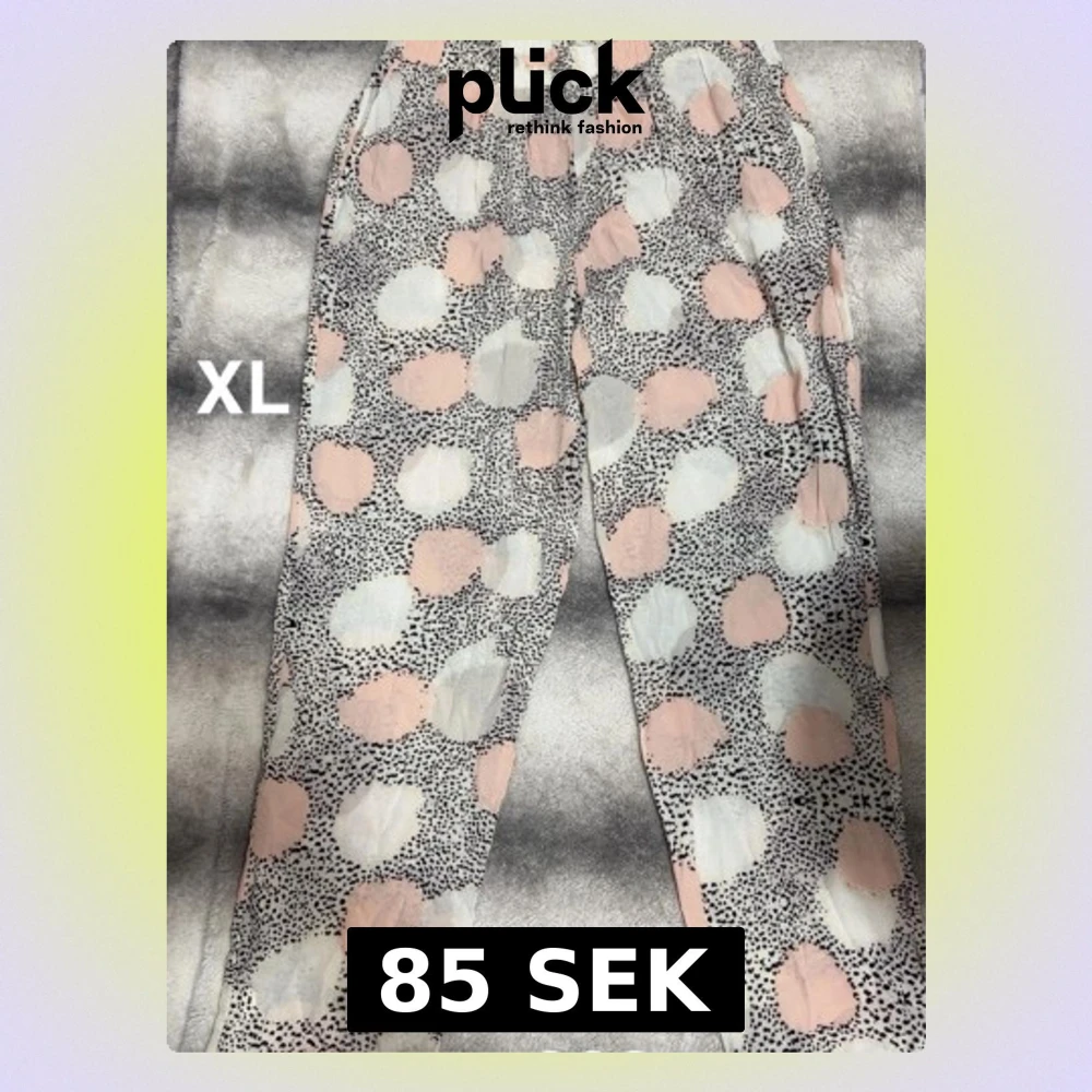 Säljer ett par byxor i storlek XL med coolt prickigt mönster i svart, vitt och ljusrosa. Byxorna har elastisk midja och är perfekta för chill dagar hemma. 🌸Sparsamt använda. Storlek XL
