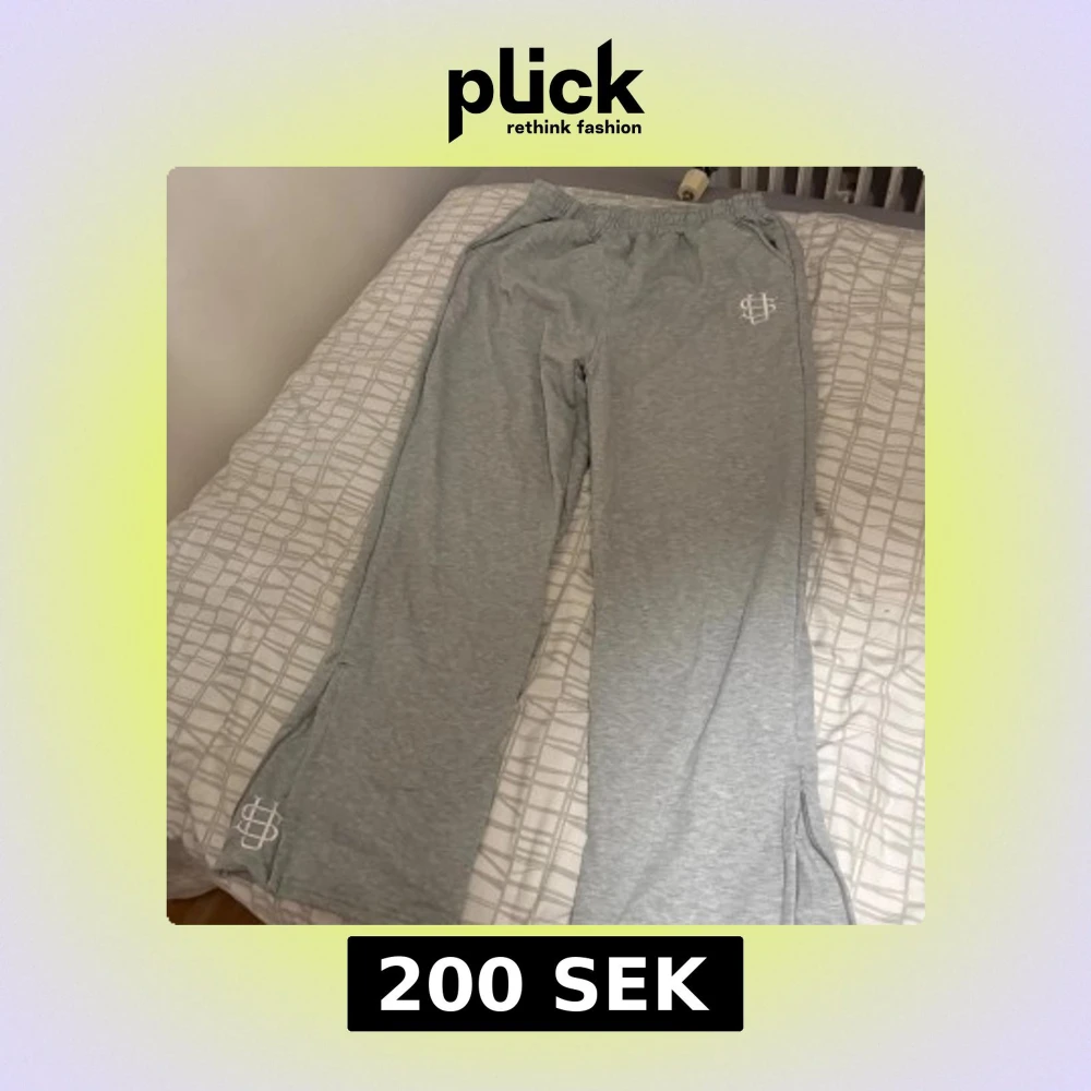 Grå mjukisbyxor med elastisk midja och vita loggor på höften och vid benslutet. Byxorna har raka ben och är tillverkade i mjukt material, perfekta för en avslappnad stil.