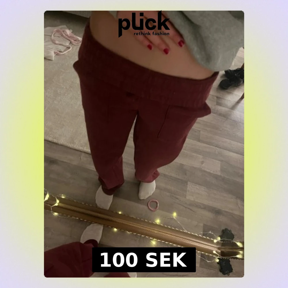 Säljer ett par vinröda mjukisbyxor med bred resår i midjan och snörning framtill. Byxorna har raka ben och är gjorda i mjukt bomullsmaterial, perfekta för chill dagar. Färgen är djup vinröd och modellen är loose fit för extra komfort.
