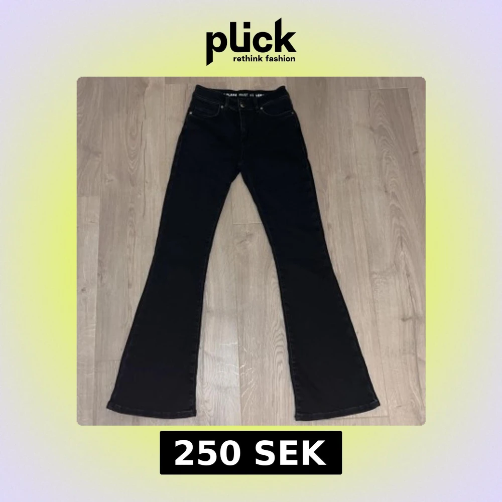 Snygga svarta jeans från Never Denim med låg midja och bootcut/flare ben. Klassisk femficksmodell med knapp och dragkedja fram. Jeansen är tillverkade i stretchigt denim som sitter skönt och ger en cool siluett.