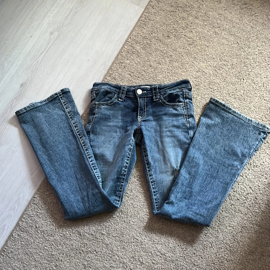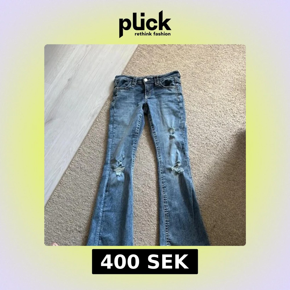 Säljer ett par blå bootcut jeans med snygga slitningar på båda benen. Jeansen har klassisk femficksdesign, låg midja och är tillverkade i mjukt denimtyg. Perfekta för dig som gillar en avslappnad och trendig look.