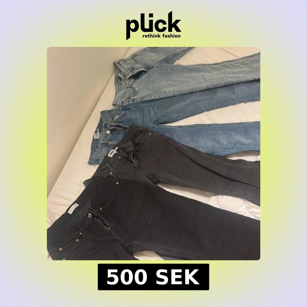 Säljer tre par jeans i olika tvättar: ett par ljusblå, ett par mellanblå och ett par svarta. Alla har klassisk femficksdesign, dragkedja och knapp. Jeansen är raka eller smala i modellen och tillverkade i bomullsdenim. Perfekta för dig som gillar stilrena och enkla jeans. 500kr för alla