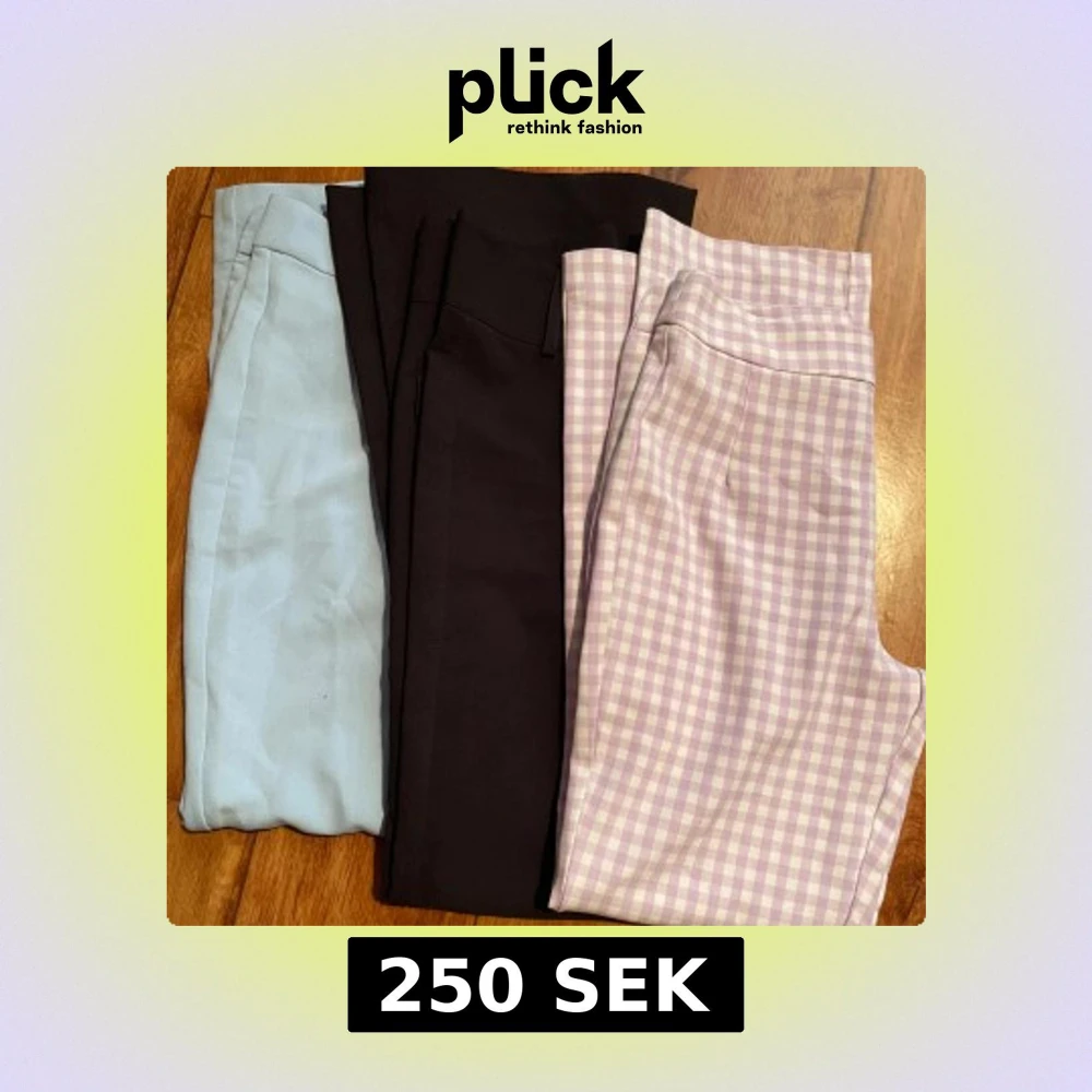 Säljer tre par byxor: ett par ljusblå med smal passform, ett par svarta bootcut-byxor och ett par lila-vita rutiga byxor med smal passform. Perfekta för dig som gillar stilrena och trendiga färger. Alla har klassisk midja och är i mjukt material. Dom svarta är köpta på Gina Tricot och dom färgade på Bik Bok. Köpare står för frakt.