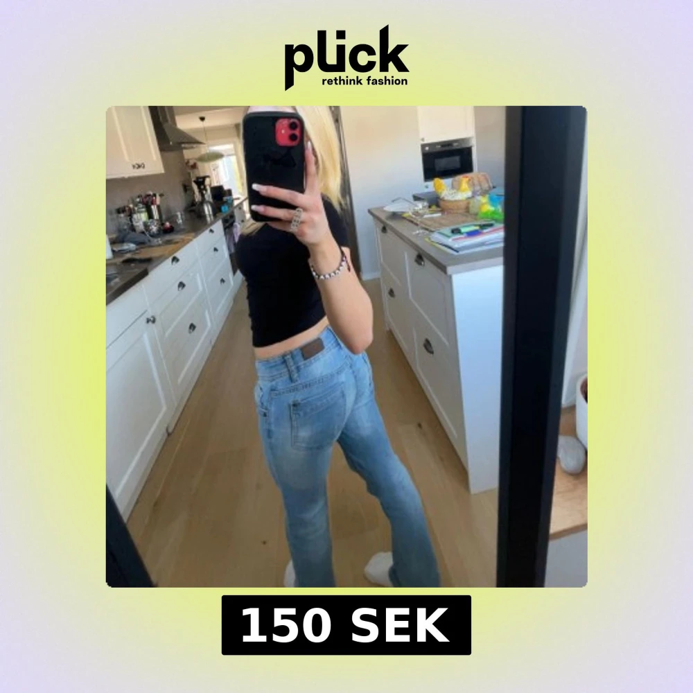 Säljer ett par ljusblå jeans med bootcut passform och låg midja. Jeansen har klassiska fem fickor och bälteshällor. Perfekta för en avslappnad och trendig look.