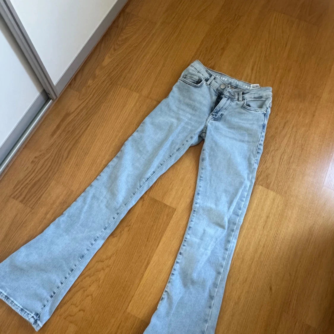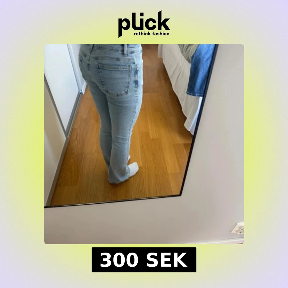 Säljer ett par ljusblå jeans med bootcut-modell och klassisk femficksdesign. Jeansen har normal passform och är tillverkade i mjukt denimtyg som sitter snyggt över höfterna och låren. Perfekta för dig som gillar en retroinspirerad look.