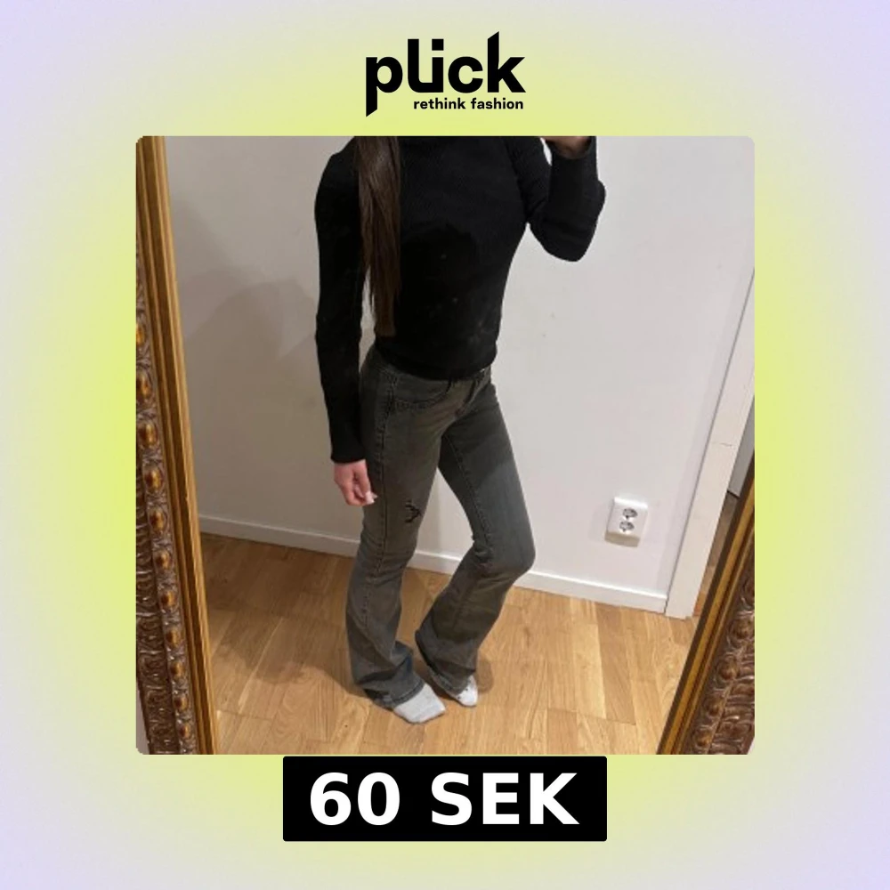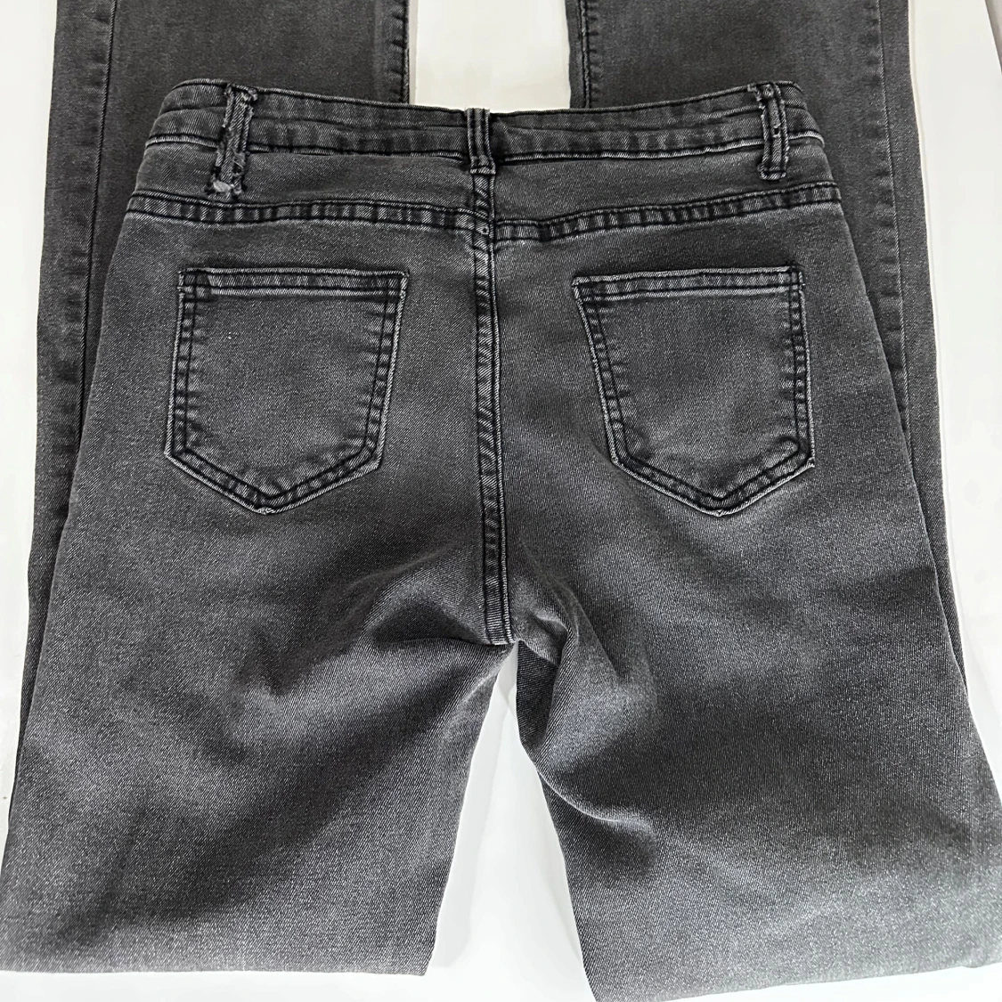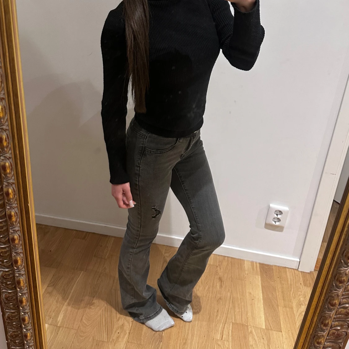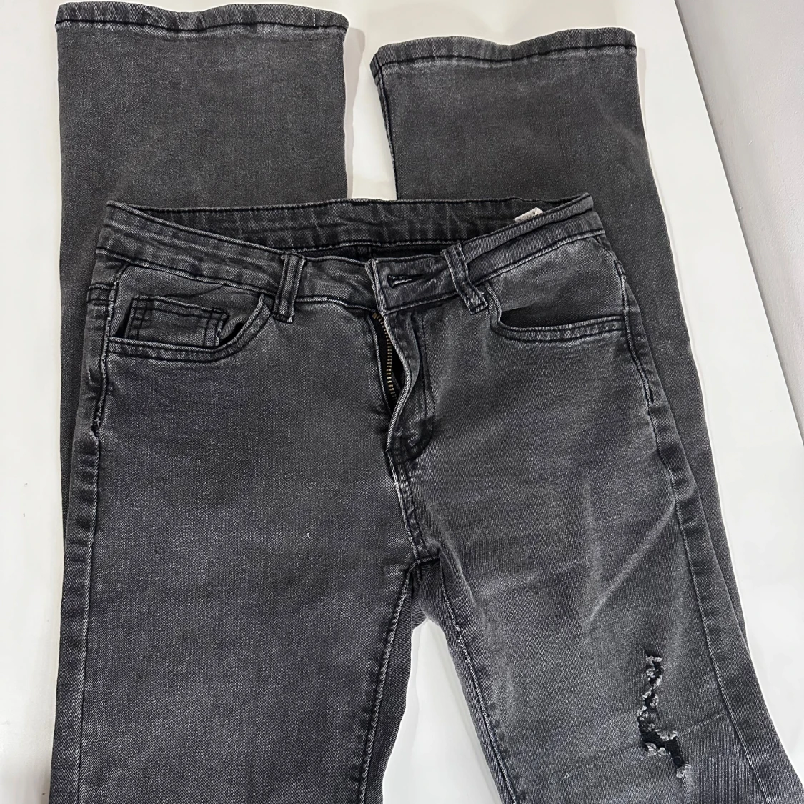 Gråa jeans med bootcut passform och lätt slitning på ena benet.