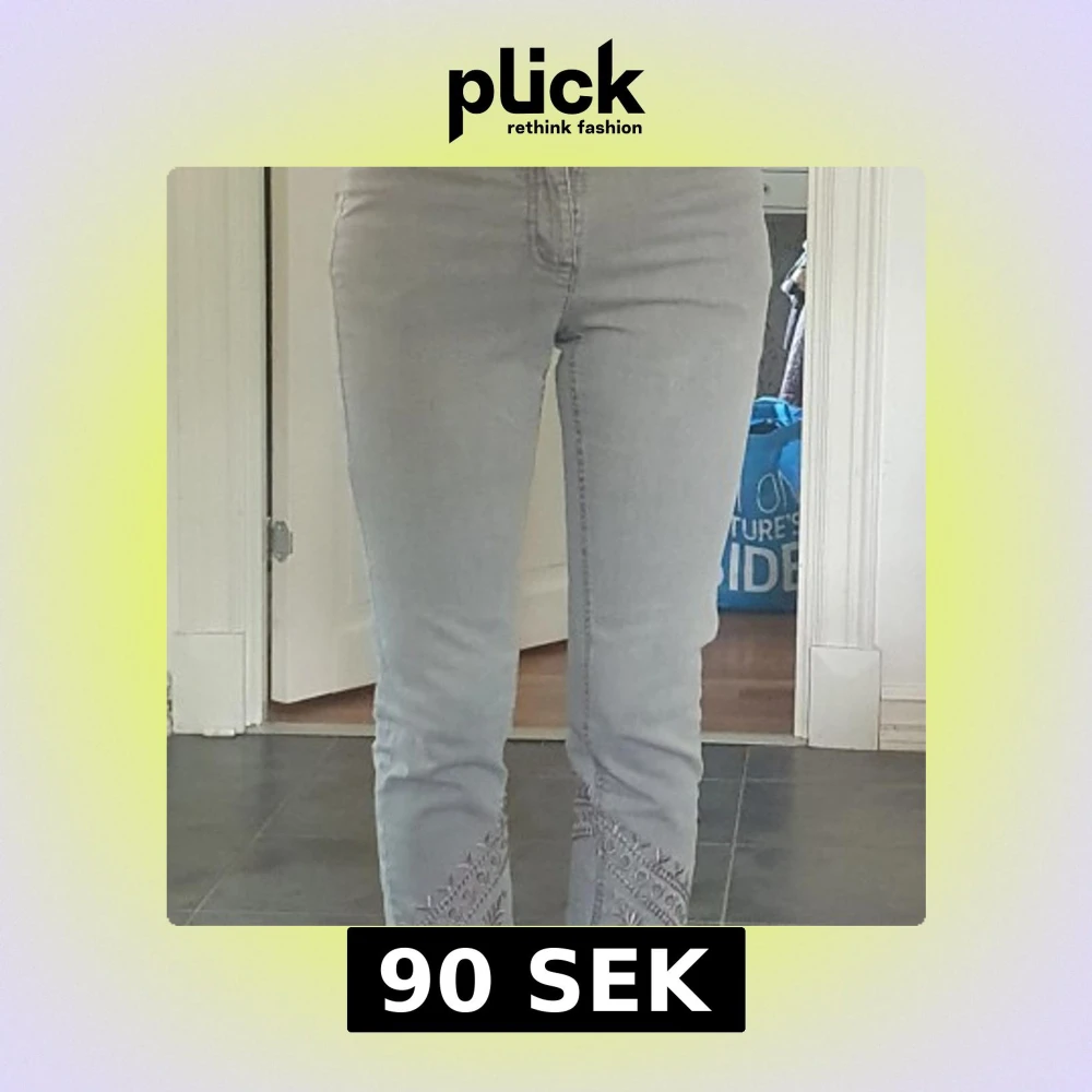 Ljusgrå jeans med broderade blommor och cirklar nertill på benen. Byxorna har dragkedja vid benslut och är i croppad modell. Ca 35 cm tvärs över vid midjan.