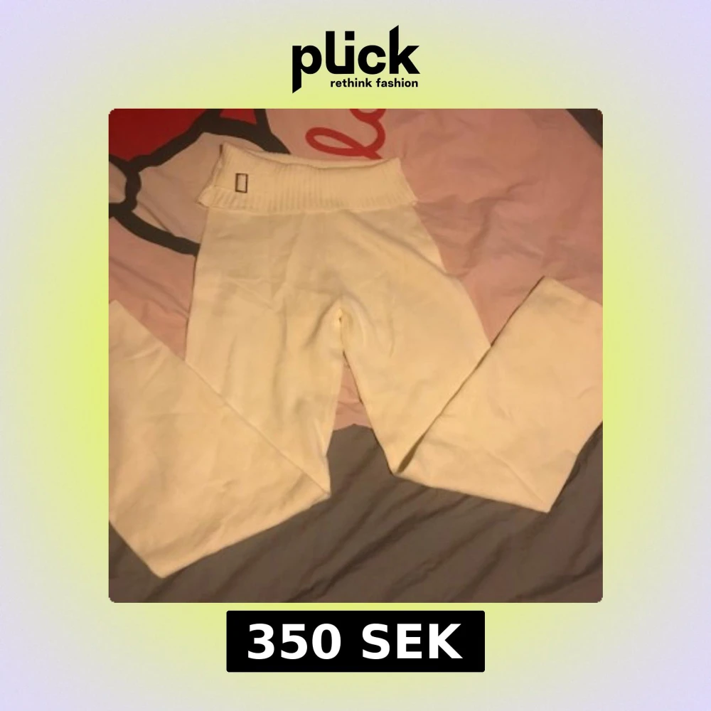 Säljer ett par vita stickade byxor. De har en ribbad detalj vid midjan och är i en loose passform. Perfekta för en mysig dag hemma eller en avslappnad dag ute.