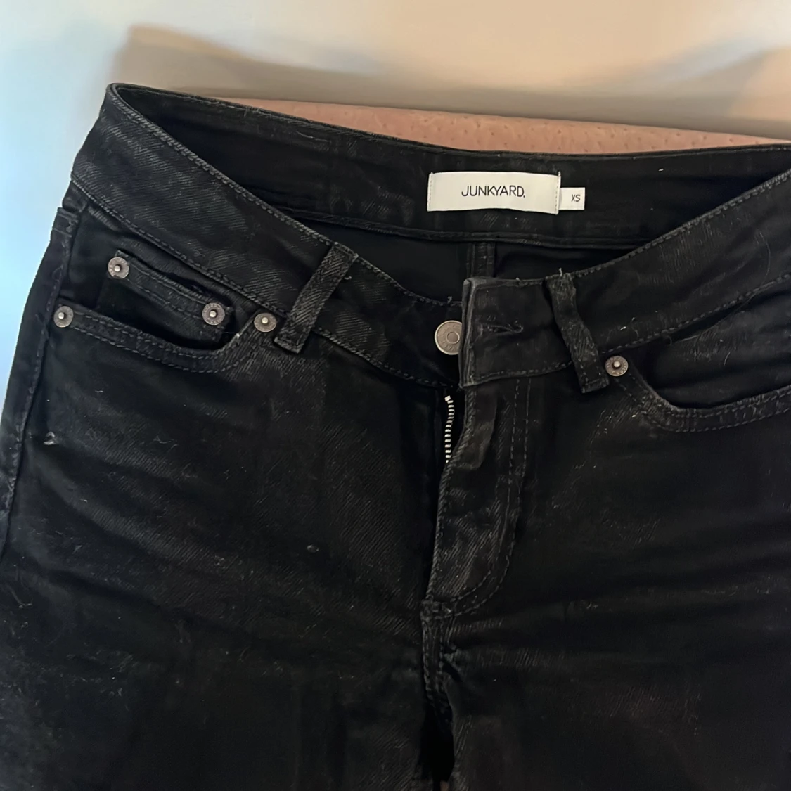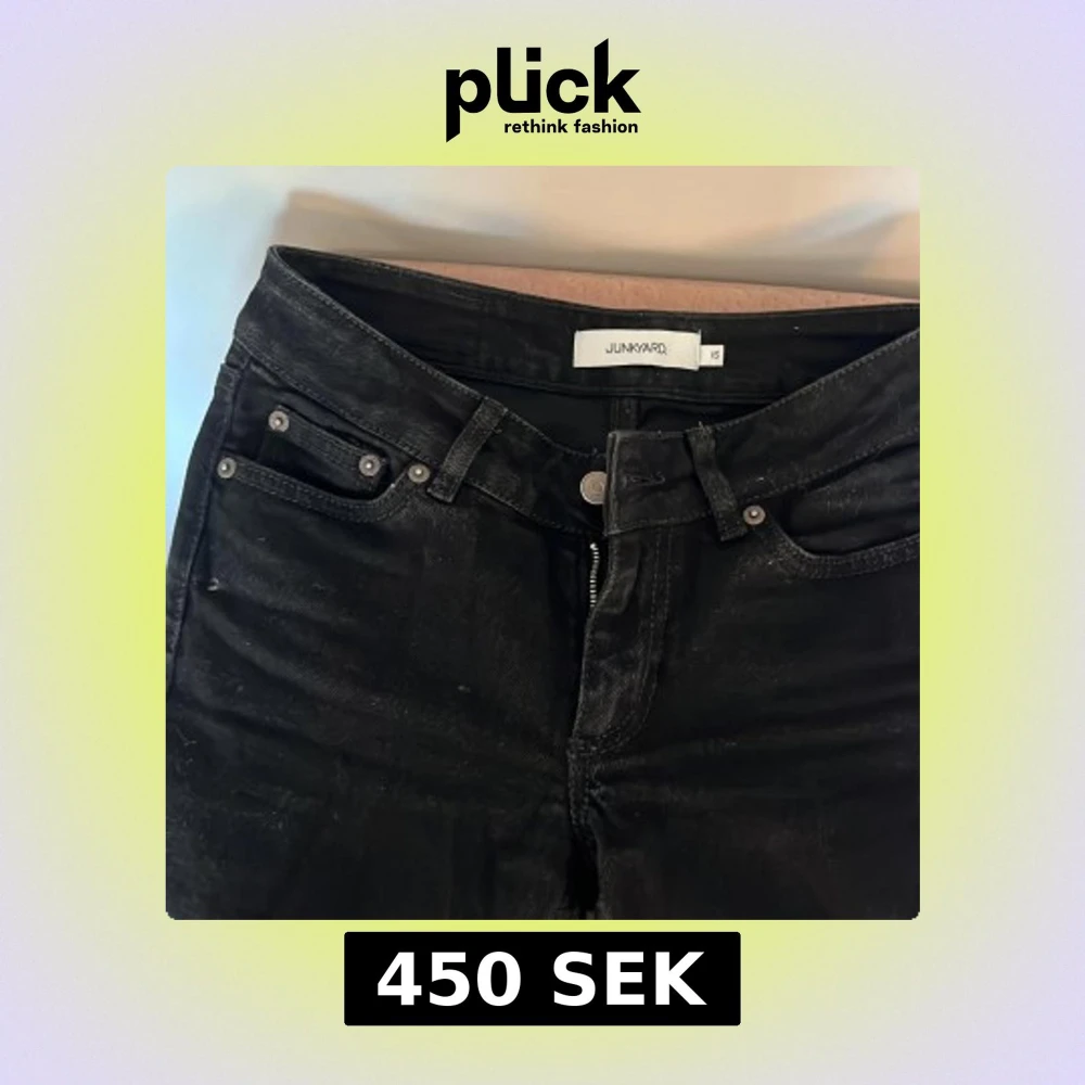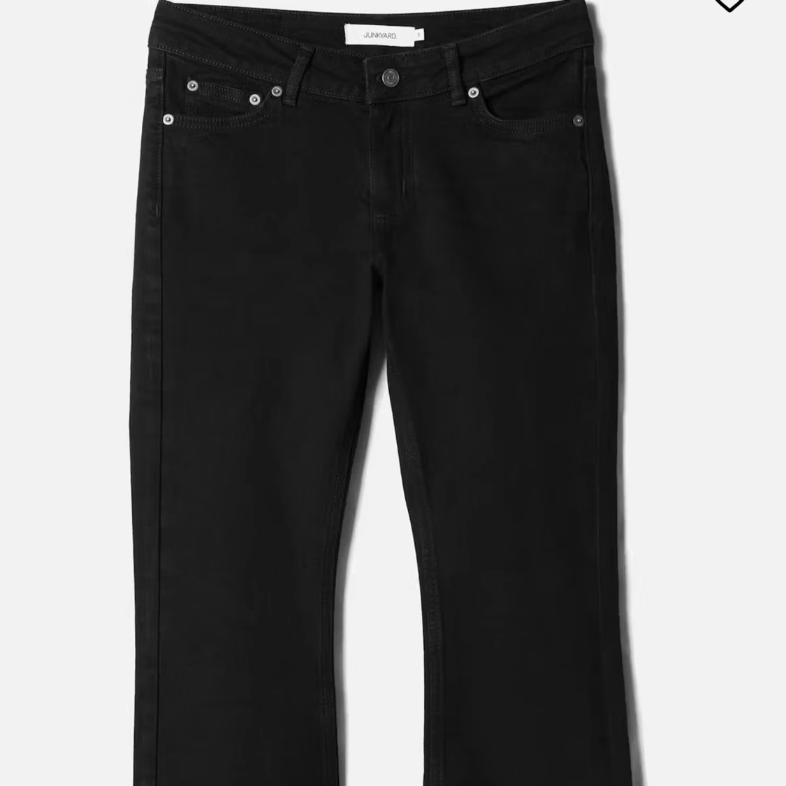 Snygga svarta jeans från Junkyard i storlek XS. De har en klassisk femficksdesign och en dragkedja framtill. Perfekta för en stilren look. Modellen är Bootcut jeans med låg midja. Färg svart och nypris 599 kr. Endast testade. Köparen står för frakt.