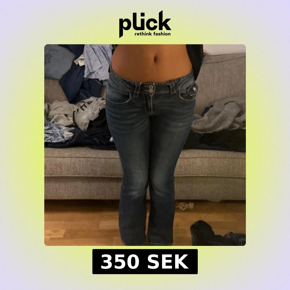 Säljer ett par mörkblå jeans med snygga slitningar och kontrastsömmar. Modellen har låg midja, bootcut-ben och klassiska fem fickor. Jeansen har dubbla knappar i midjan och är tillverkade i stretchigt denim för en bekväm passform.