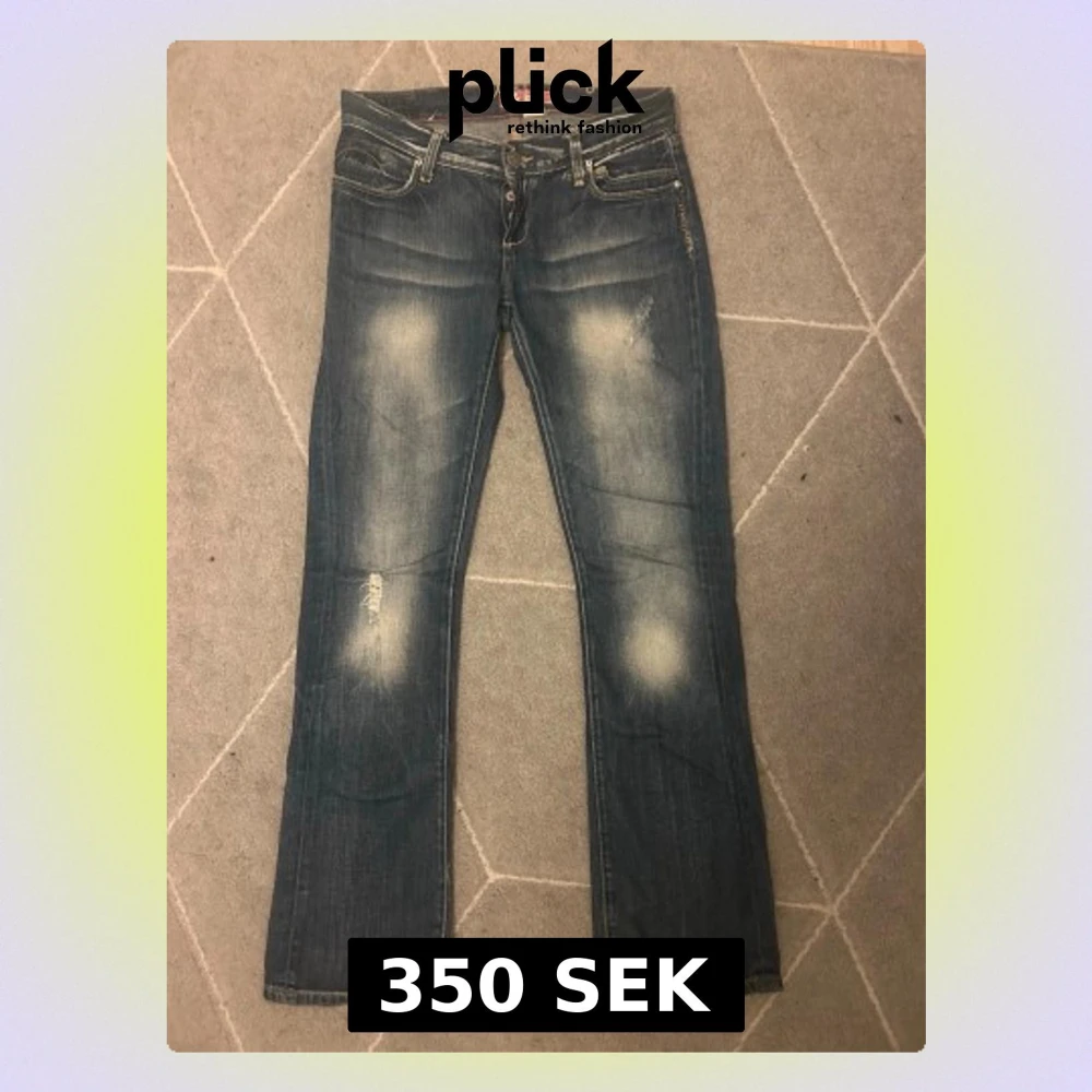Jeans i stl W27 (XS) med slitna detaljer och ljusa partier framtill. Klassisk femficksmodell och knappgylf. Rakt över jeansen: 39cm. Passar mig som är 165cm lång.