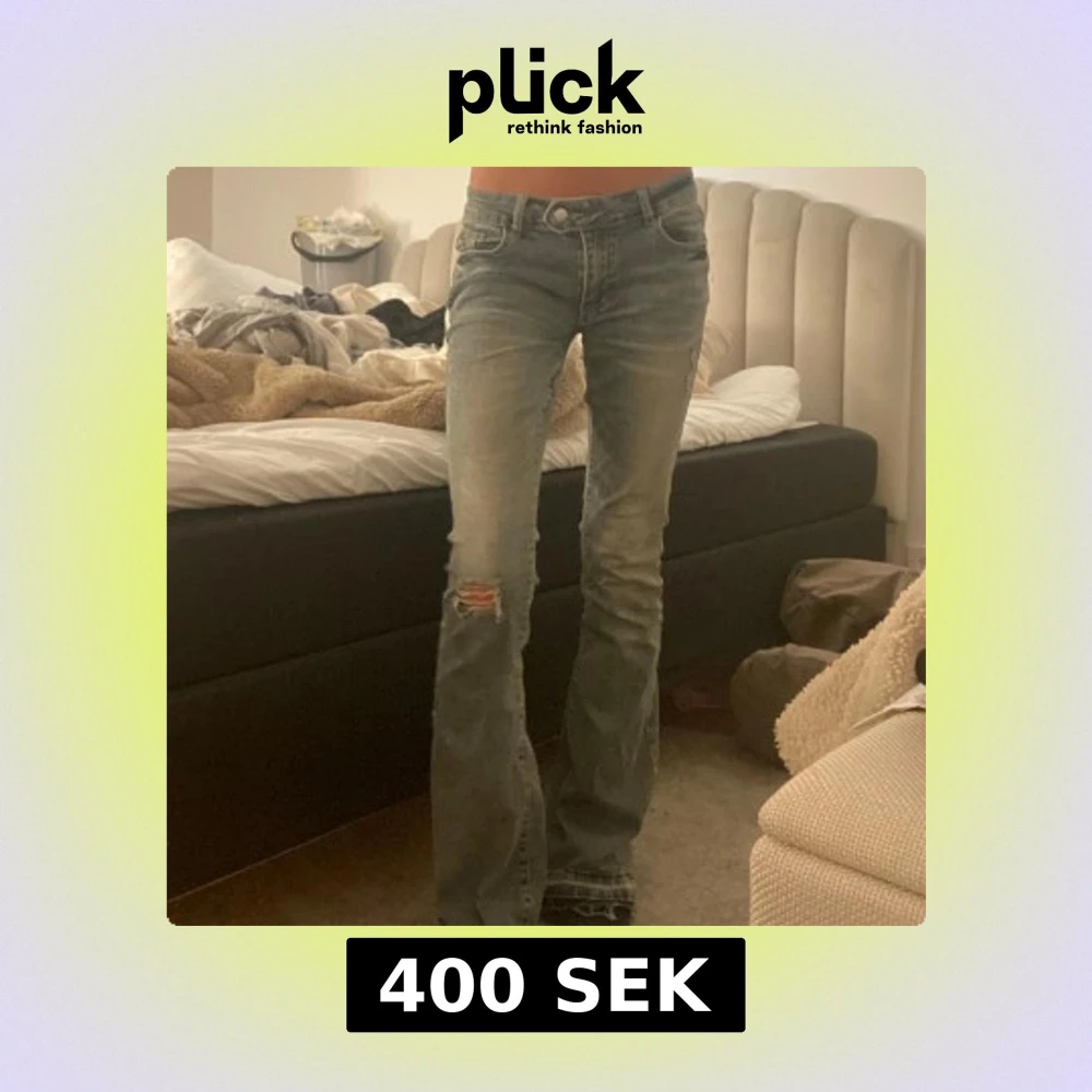 Säljer ett par blå bootcut jeans med snygg slitning på ena knät. Jeansen har klassisk femficksdesign, normal passform och är tillverkade i jeansmaterial. Perfekta för dig som gillar en avslappnad men trendig look.