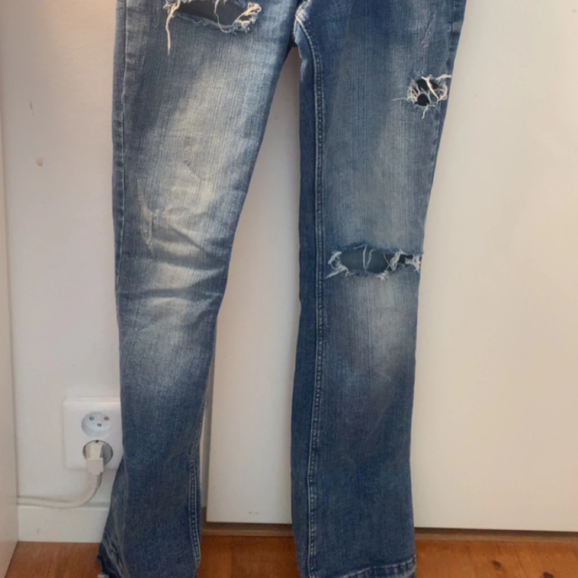 Säljer dessa jättefina low waist bootcut jeans med hål 😍aldrig använda av mig men vet tyvärr inte om de är använda av förra ägaren. Vet inte märket de är ifrån och vet tyvärr inte storleken, men passar mig som är 164cm och som brukar ha storlek 34-36 nästan perfekt 💕byxorna är uppklippt längst ner för att bli lite längre 💕