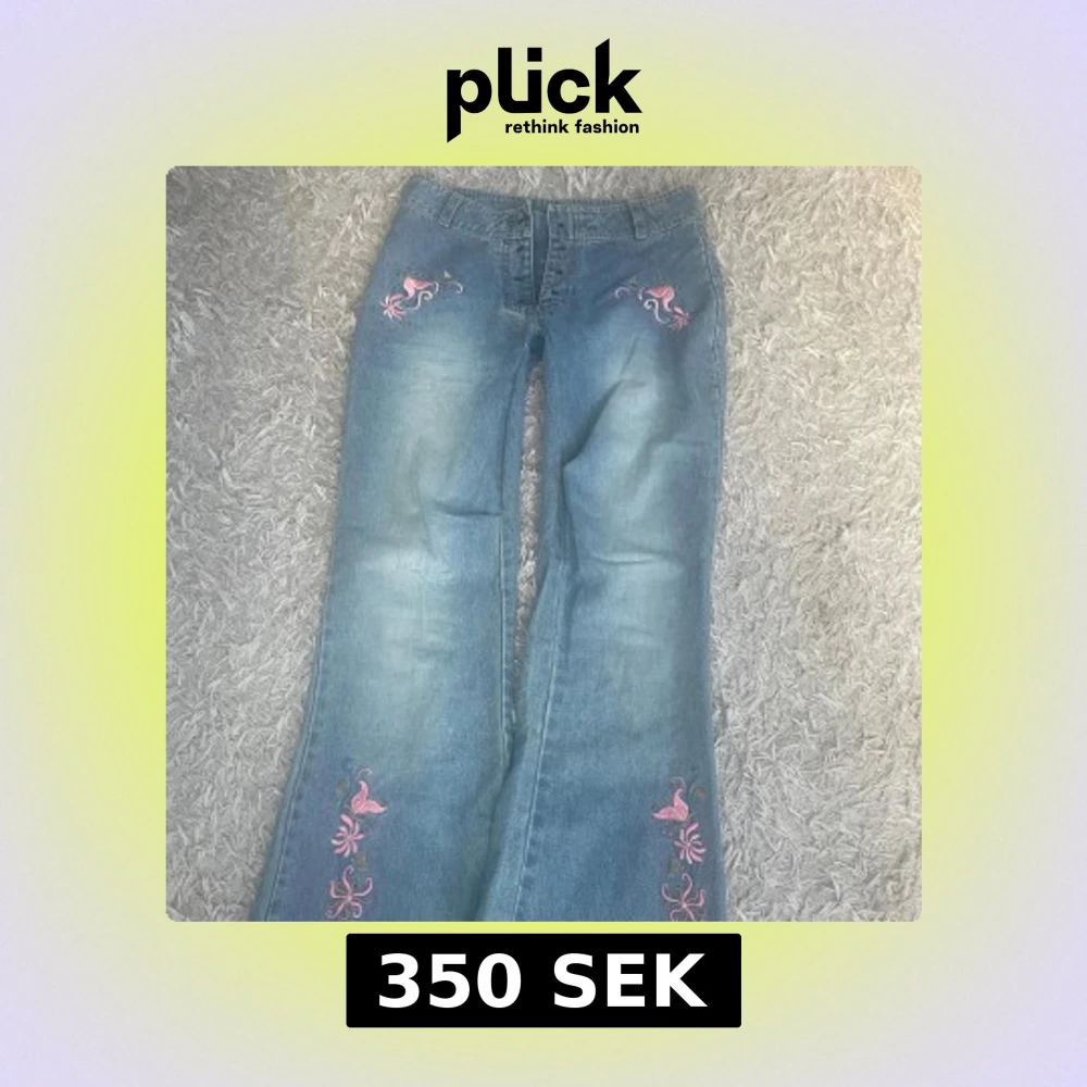 Snygga blå jeans med broderade rosa blommor och fåglar på benen. Jeansen har en rak och lite vidare passform och är tillverkade i klassiskt denimtyg. Perfekta för dig som vill sticka ut med coola detaljer och färgglada broderier.